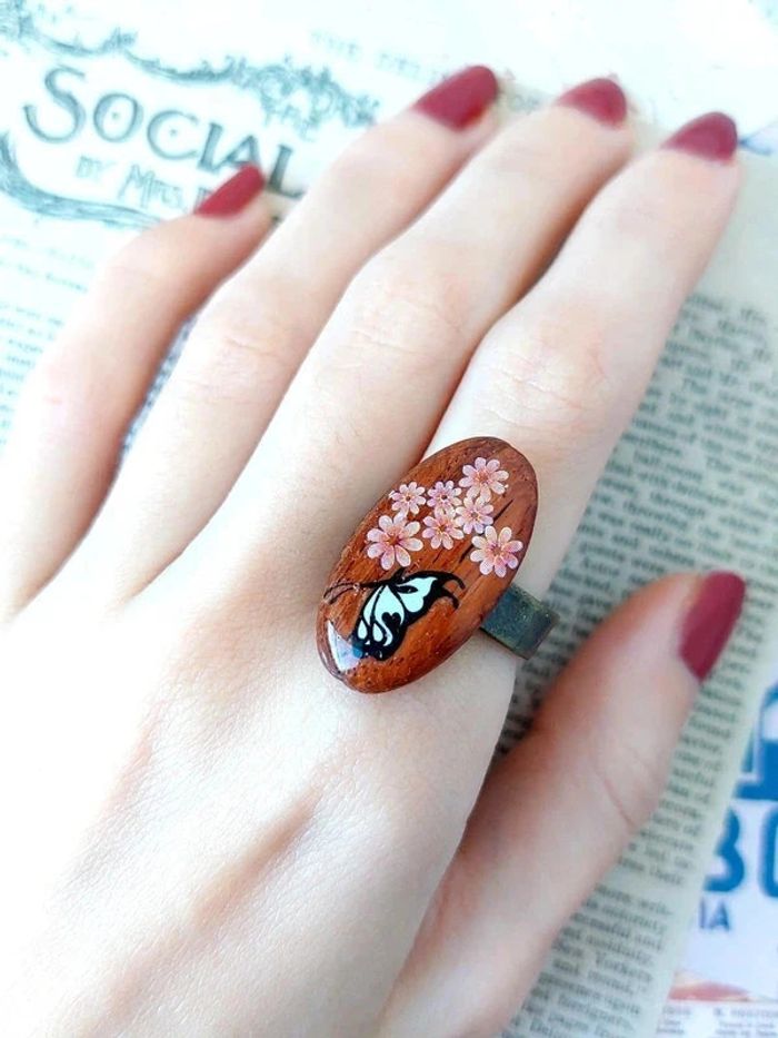 Magnifique petite bague ajustable, en bois avec papillon et fleurs