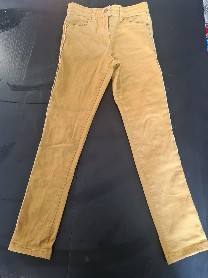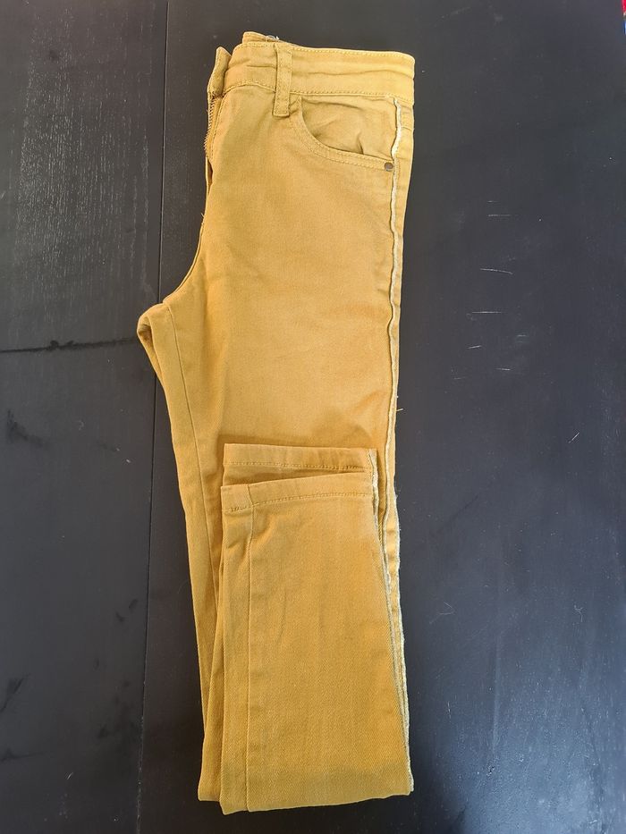 Jean moutarde, 10 ans, couture dorée et pailletée sur les côtés. La couleur est plus vive que sur les photos.
