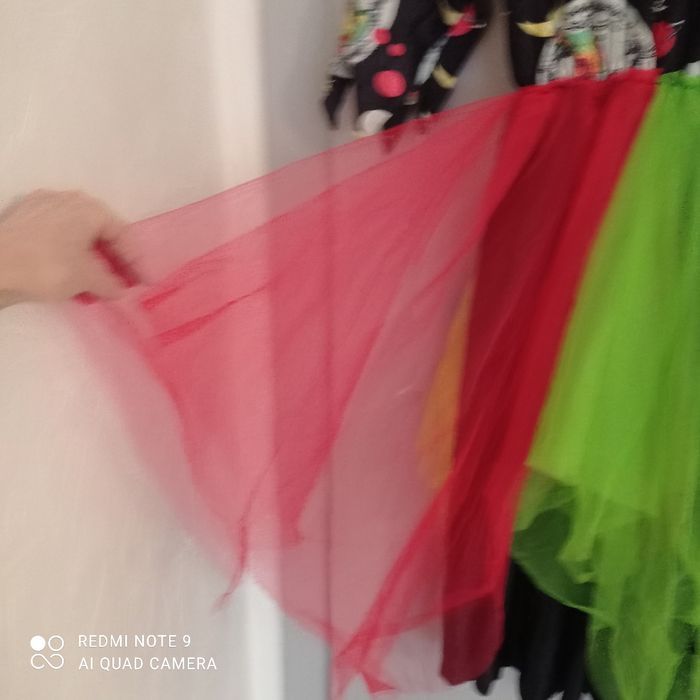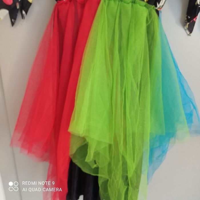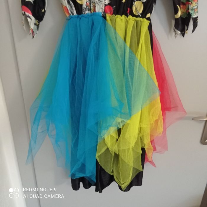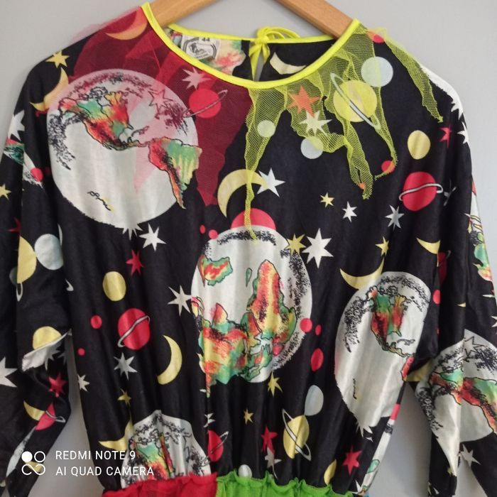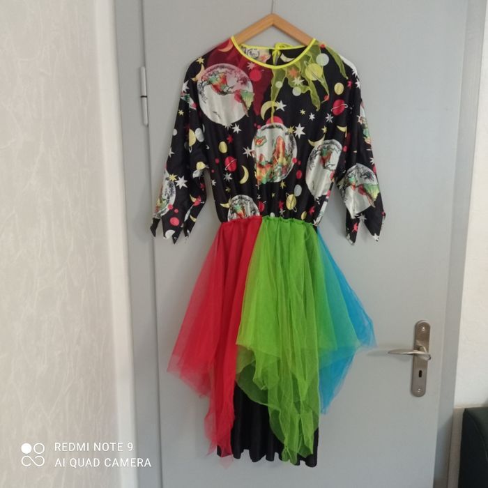 Originale. Partie haute motif planètes, partie jupe avec des pans de tulle multicolores. Déchiré troué par endroits voir photos. Déguisement. Étiquetée t44. Voici les mesures prises à plat : épaules : 60cm, aisselles : 47cm, longueur : 116cm.
