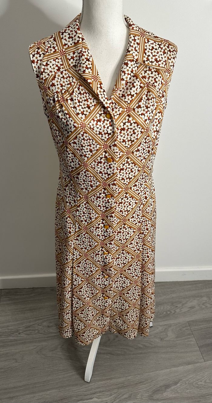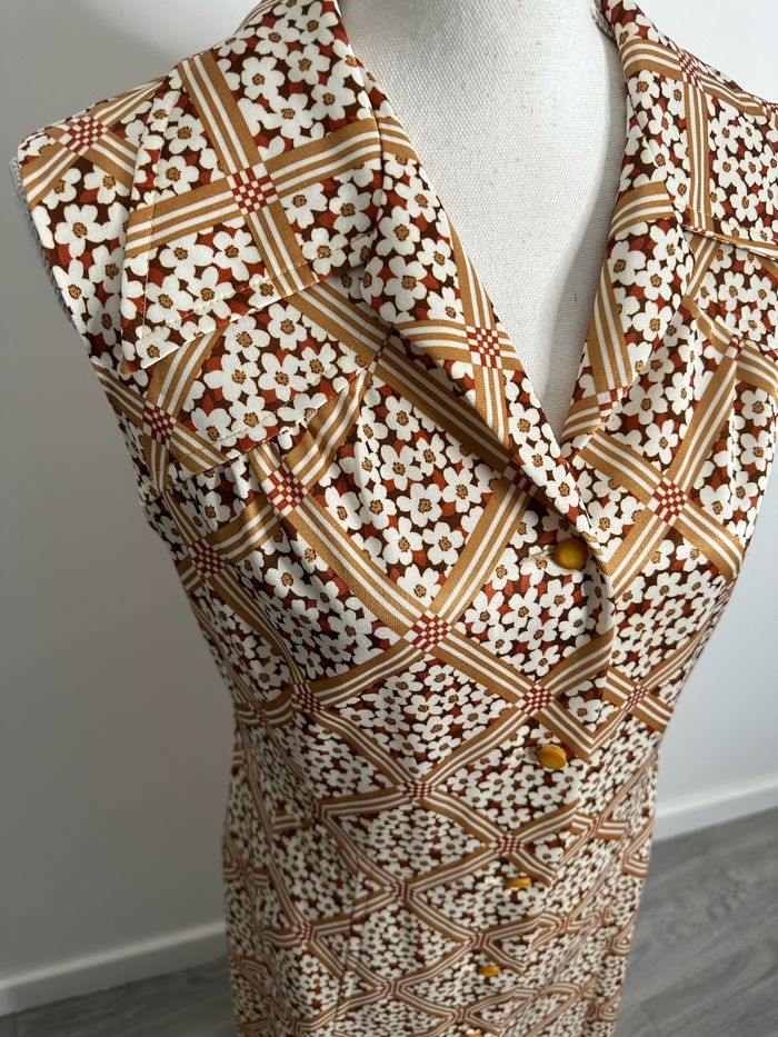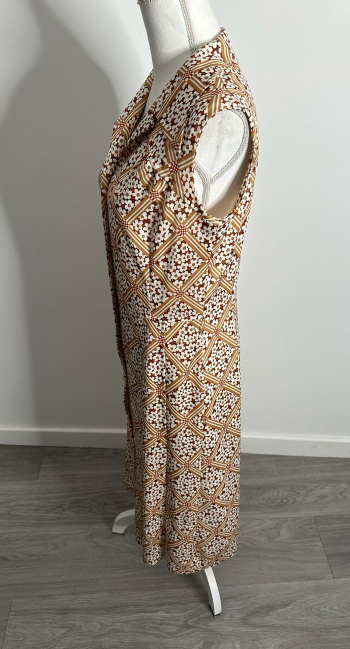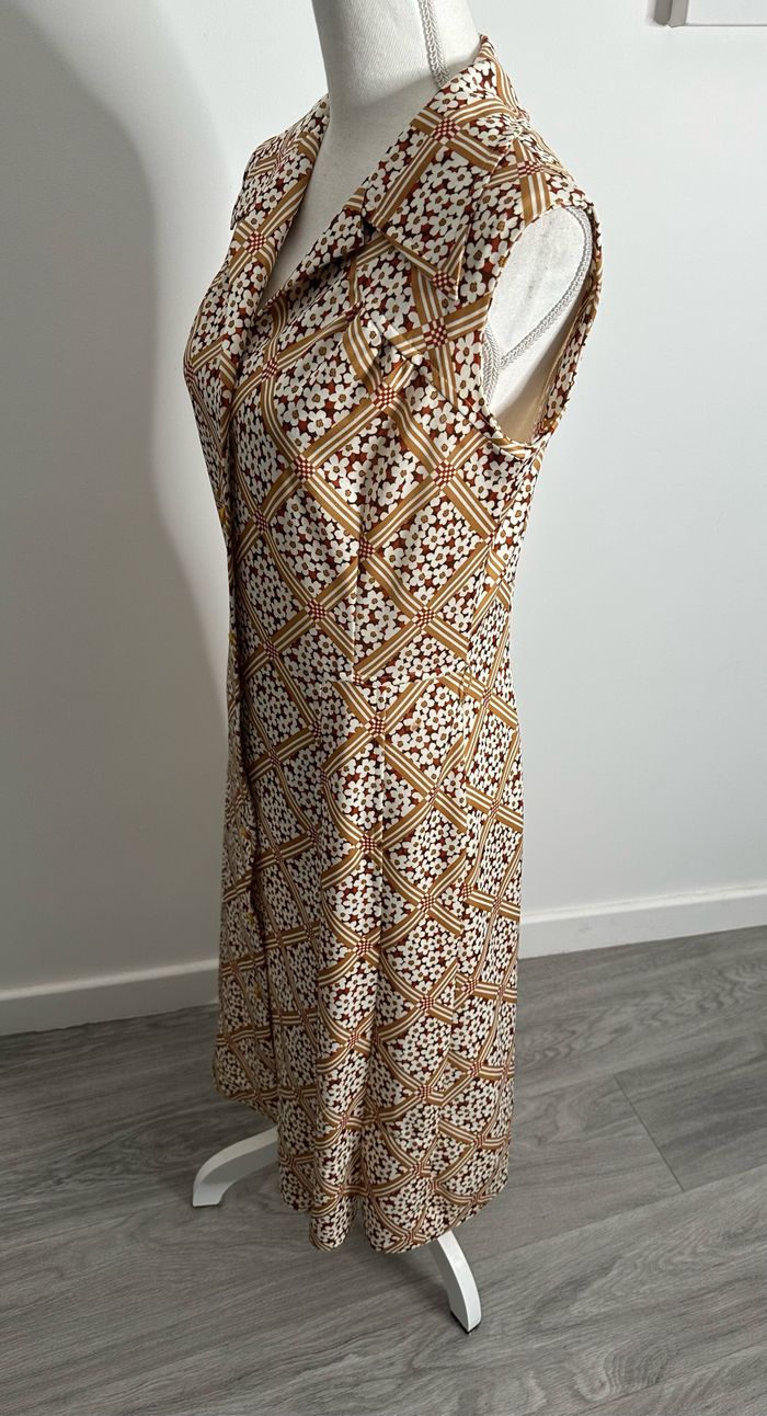 Robe - Excellent état - Taille 38 équivalent M - Bariolée à fleurs - Sans manche - Se ferme avec des boutons - Vintage, seventies - Style bohème flower power - Tissus fluide - Beige, marron, bordeaux et blanc - Pas d’étiquette de taille ni de matière Dimensions: - 46cm niveau aisselles - 107cm de long