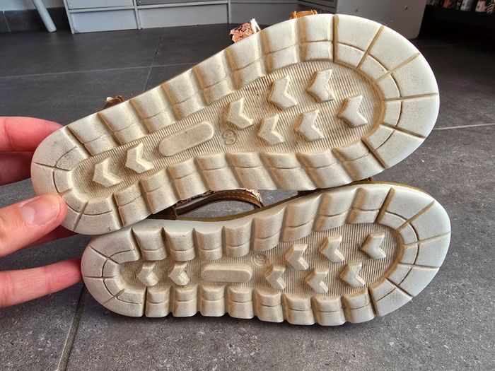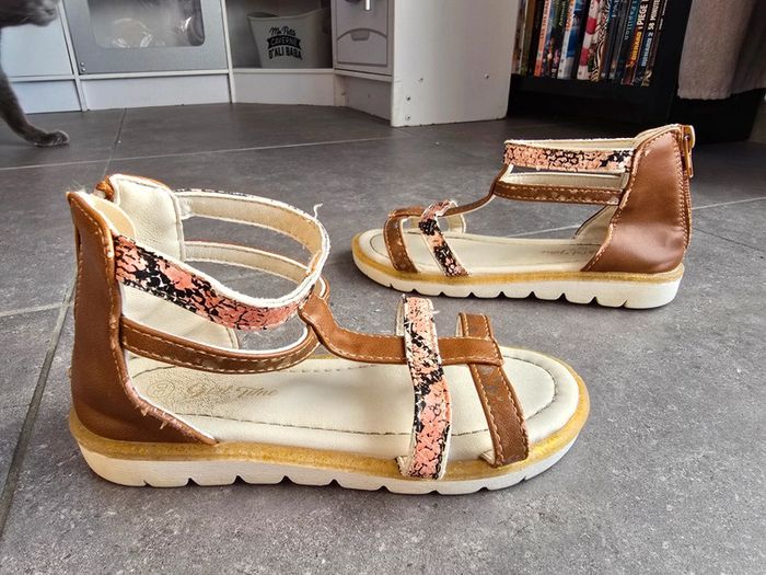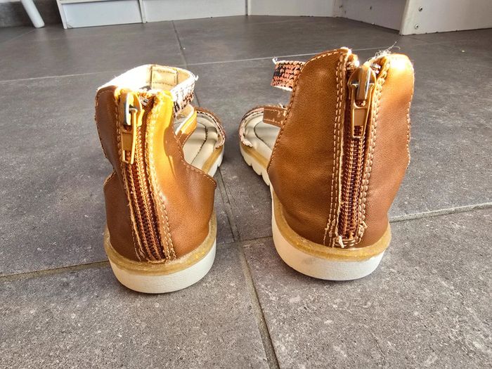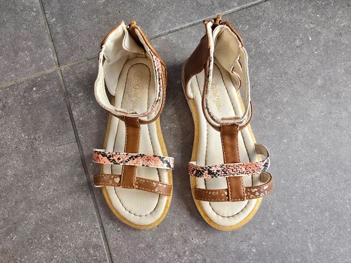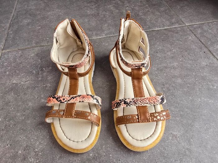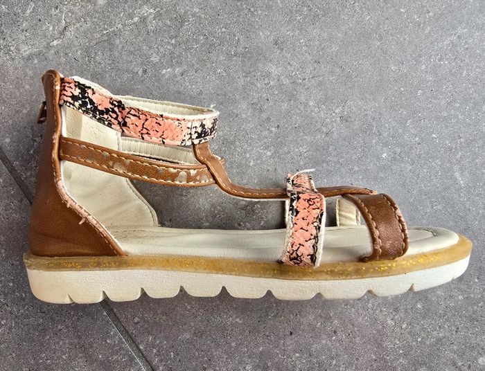 Portées mais encore en bon état Des sandales stylées pour l'été, votre enfant va les adorer ! - Sandales plates - En simili + tissu - Ouverture zippée au dos - Intérieur doublé en simili - 2 brides imprimées 'coeurs' all over - 2 brides imprimées effet 'piton' all over - Semelle d'usure antidérapante