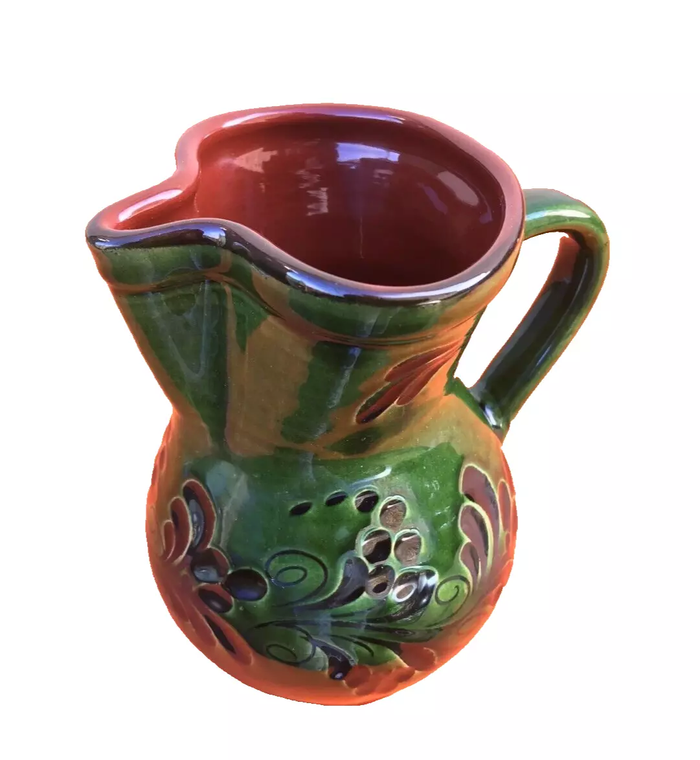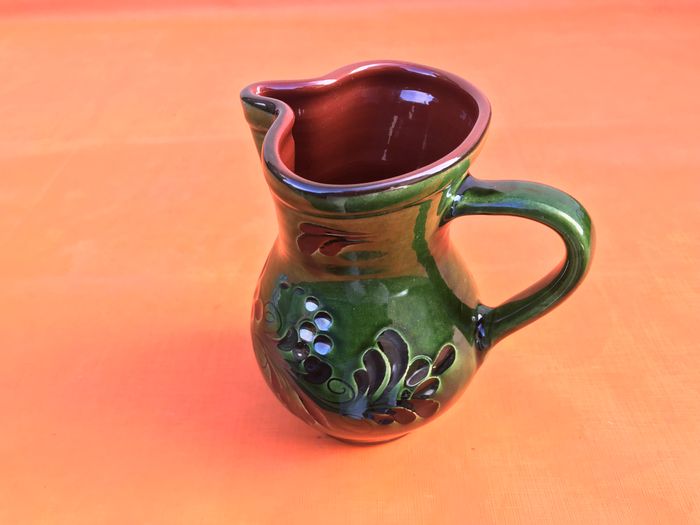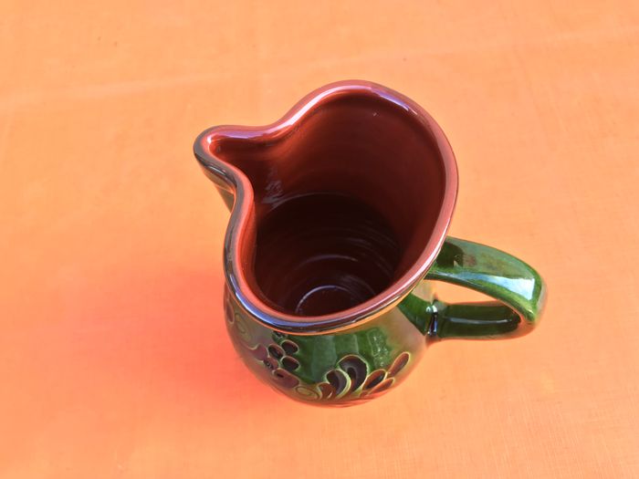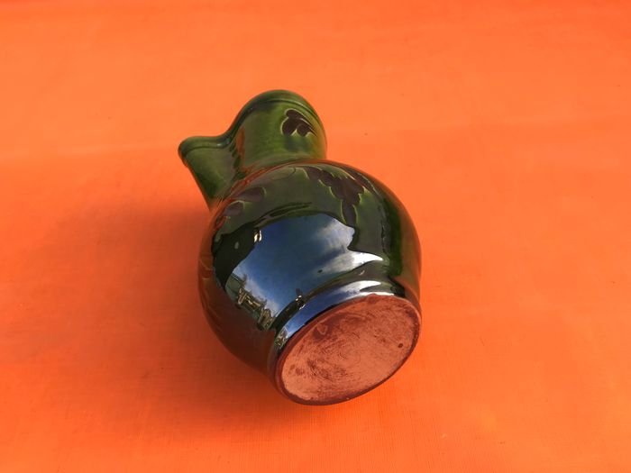 Années 1960 Pichet décor feuilles d' acanthe Terre cuite émaillée vert Intérieur émaillé marron Hauteur : 210mm Contenance : 650ml Poids : 640grs