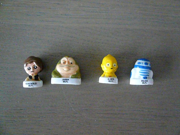 Fèves Star Wars – Carrefour 2023 : - Han Solo, - Jabba, - C-PO, - R2-D2. Neuf. N’hésitez pas à regarder mes autres annonces pour réduire les frais de port. 1€ la fève.