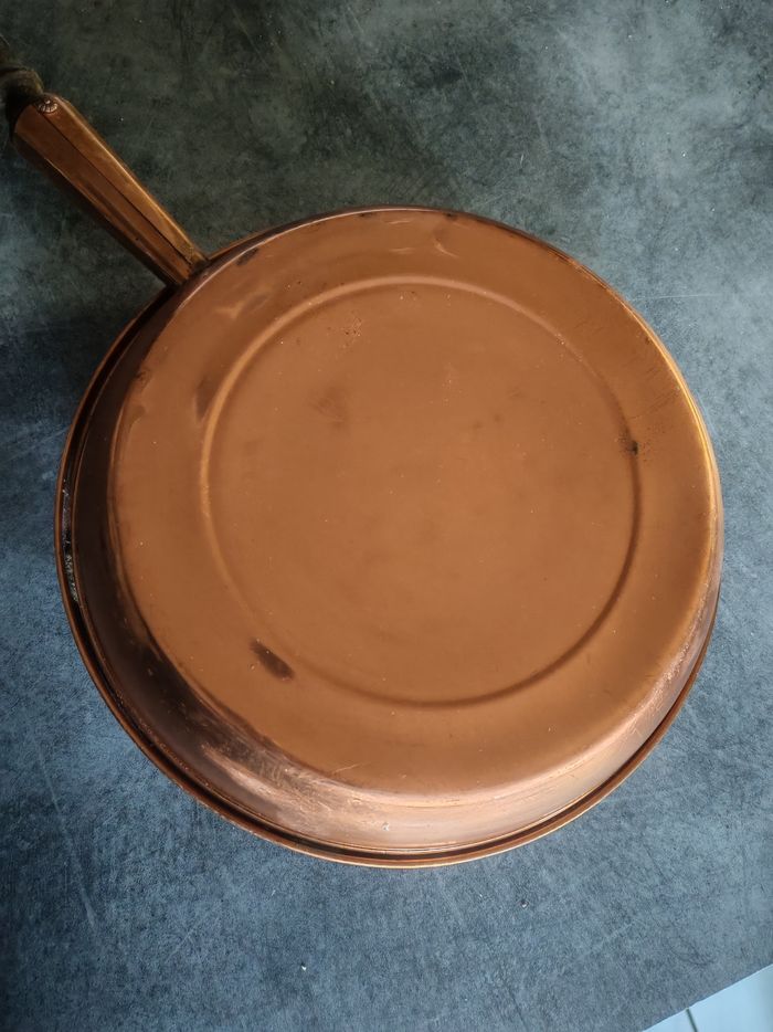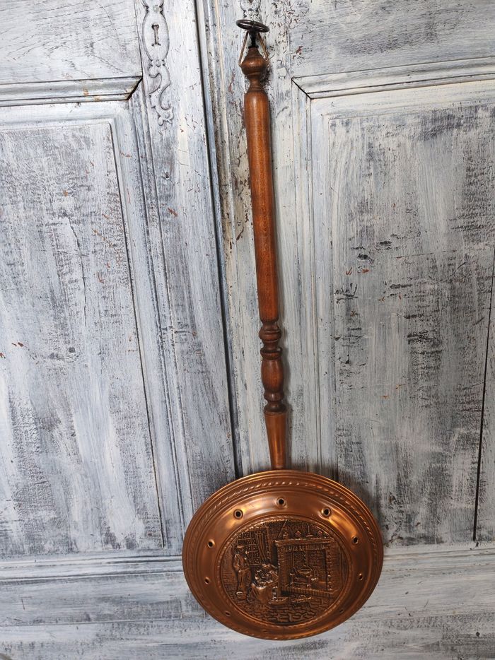 Environ 29cm de diamètre/ 7cm d'épaisseur. Environ 77cm de longueur totale avec le manche en bois.