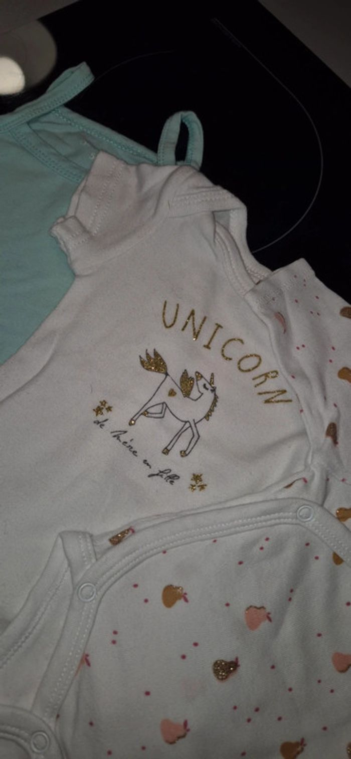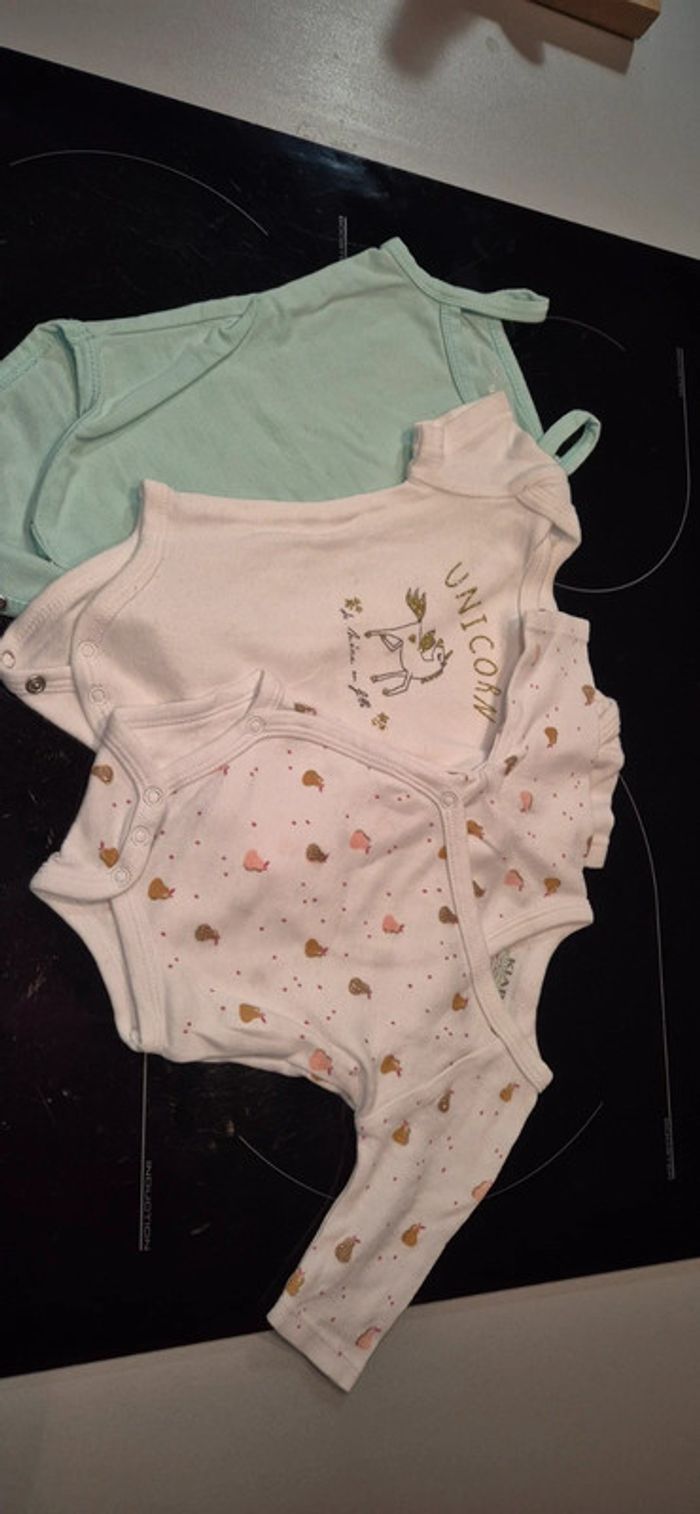 Vends lot de bodies bébé filles Neufs Manches longues (kiabi) manches courtes (mes petits cailloux) et bretelles (zeeman) Le manches longues a des pressions sur le devant comme un cache coeur