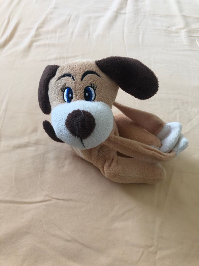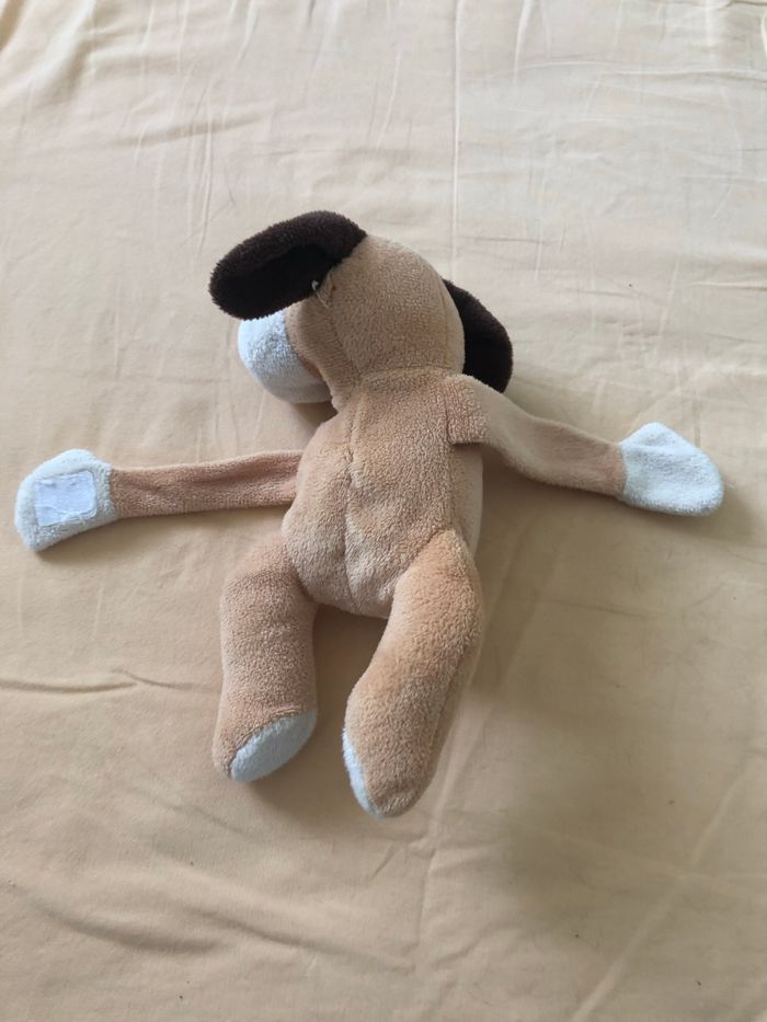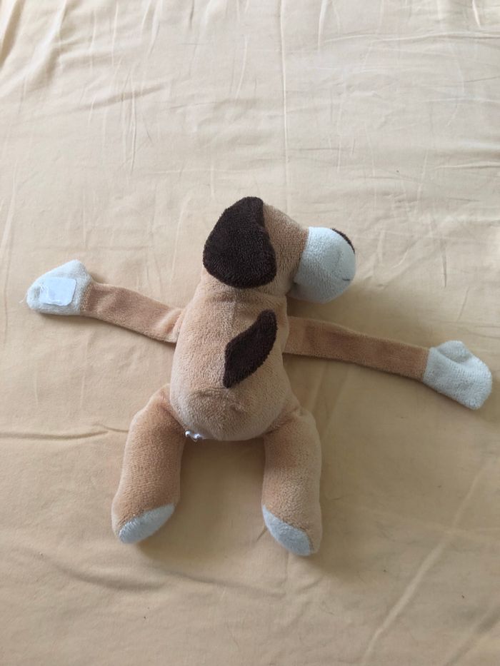 Peluche chien avec système d’attache par scratch au niveau des pattes ( voir photo)