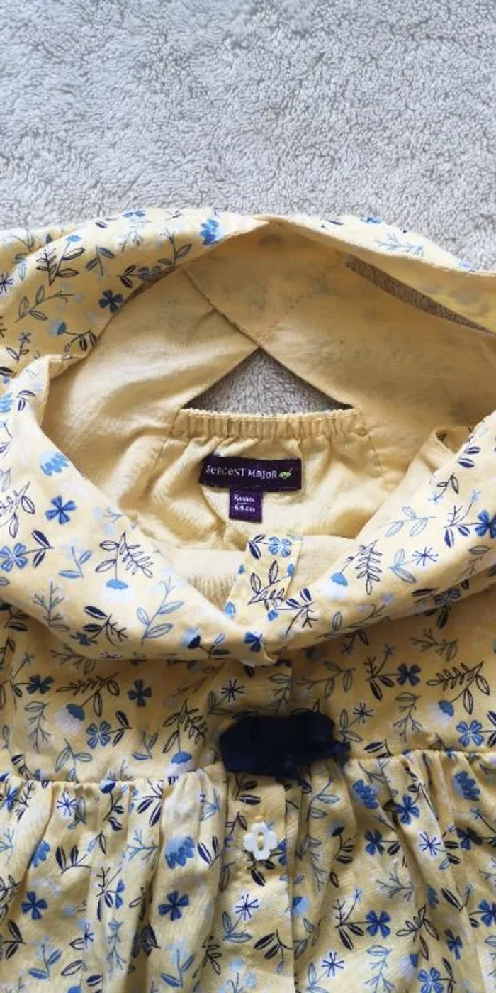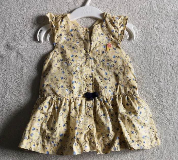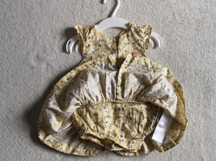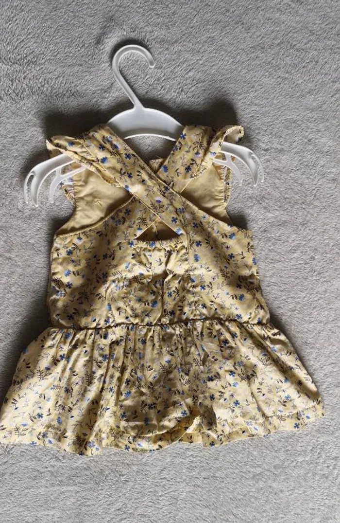 Ensemble composé d'une robe jaune fleurie avec bloomer intégré, bouton fleur et petit nœud bleu et de son bandeau Taille 6 mois / 68 cm Marque Sergent Major
