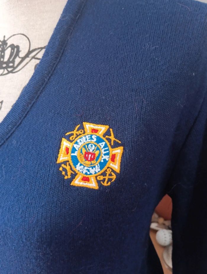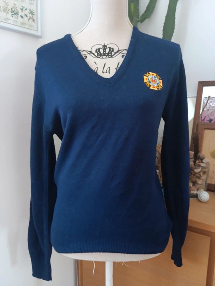 Pull vintage col V champion made in USA Bleu foncé/ marine Pas de défaut Seul le badge est un peu effilé. Peut être un mélange laine et acrylique ; il n'y a plus d'étiquette. Mesures Épaules 43cm Aisselles 53cm Longueur 65cm Tout petit accro en bas, voir dernière photo