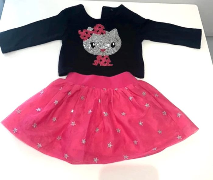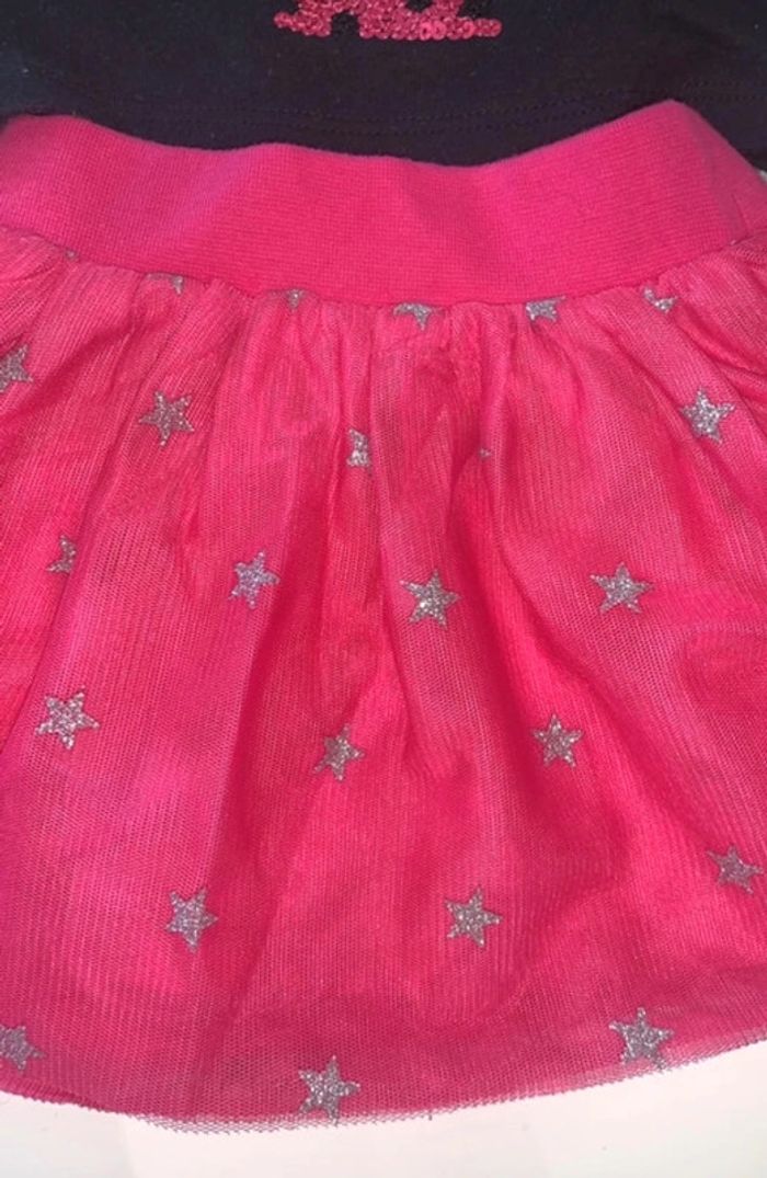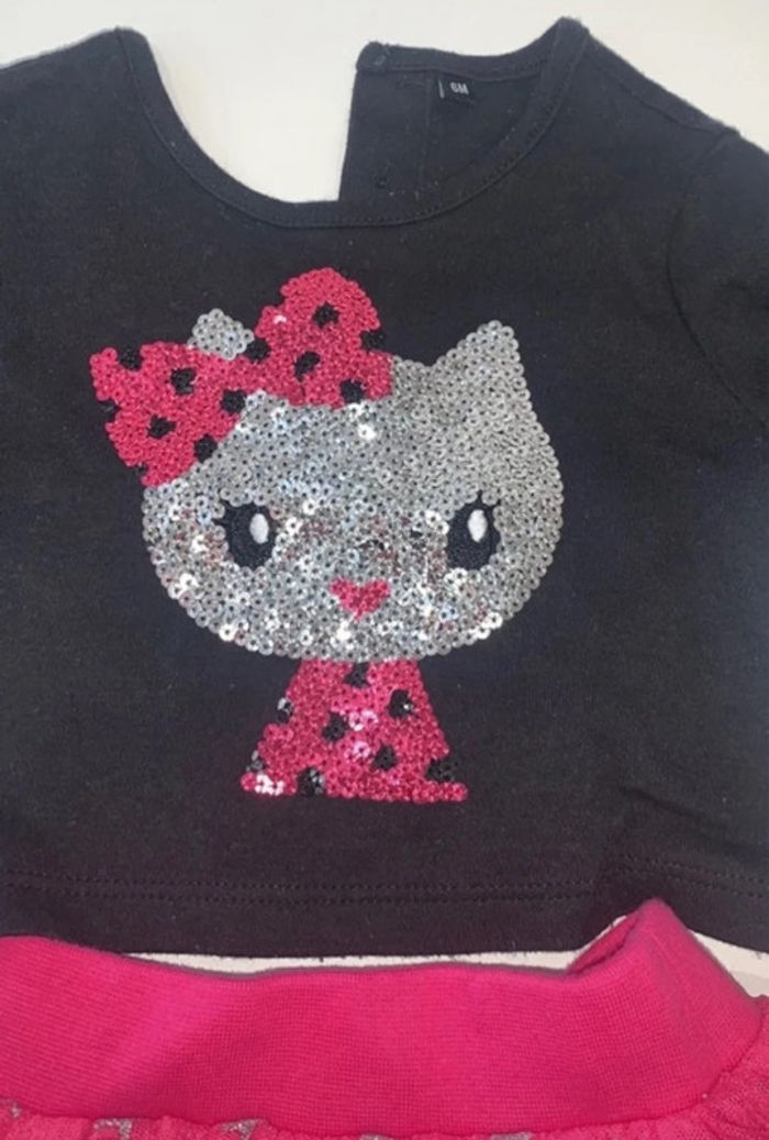 Ensemble t-shirt motifs sequins rose et argenté hello kitty avec jupe tutu rose avec étoiles argentées Taille 6 mois Excellent état porté 1 fois