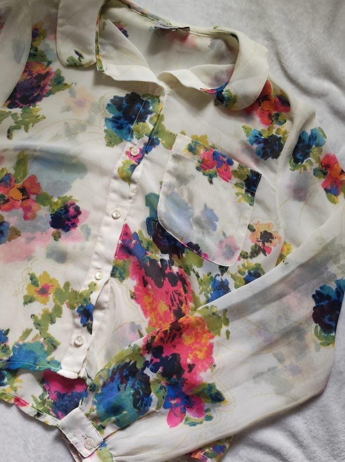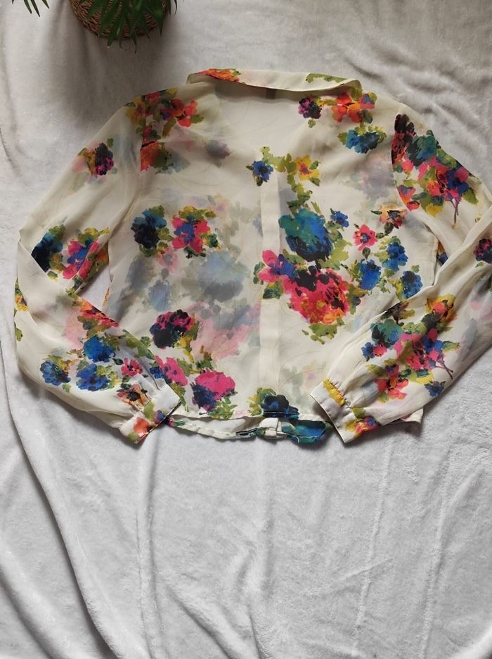 petit chemisier court à manches longues, légèrement transparent aux motifs fleuris non blanc mais jauni vielliot. Ni trou tâches ou déchirures. Marque asos en taille 36 / S.