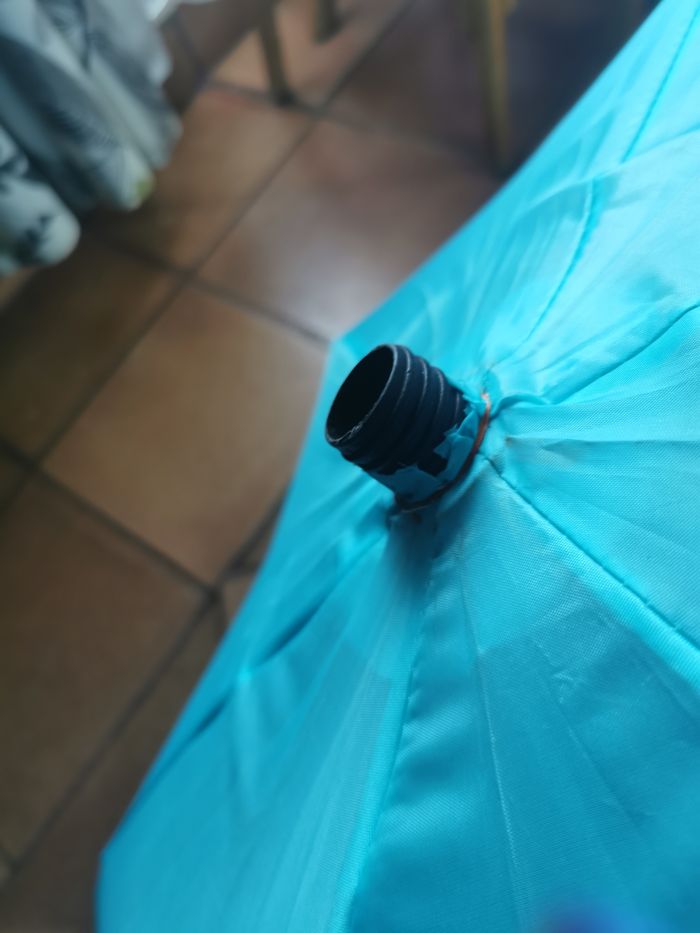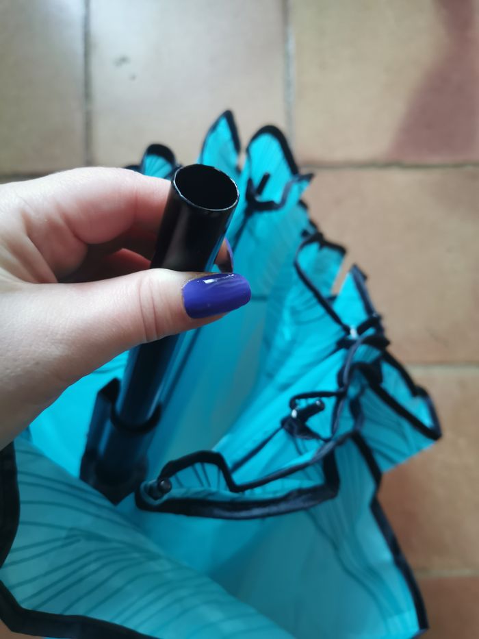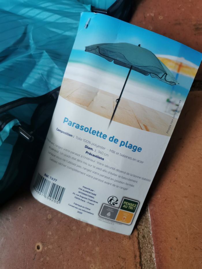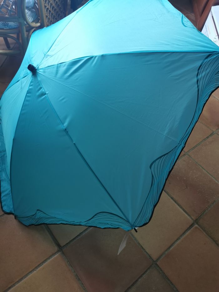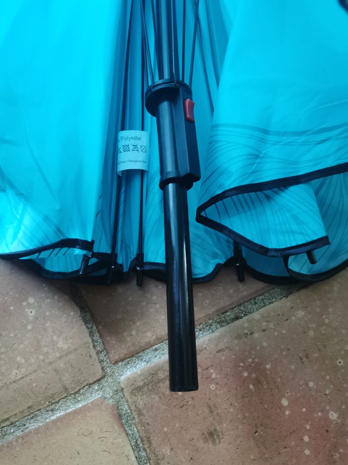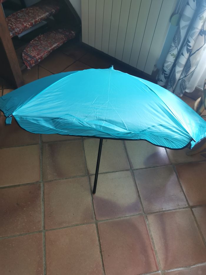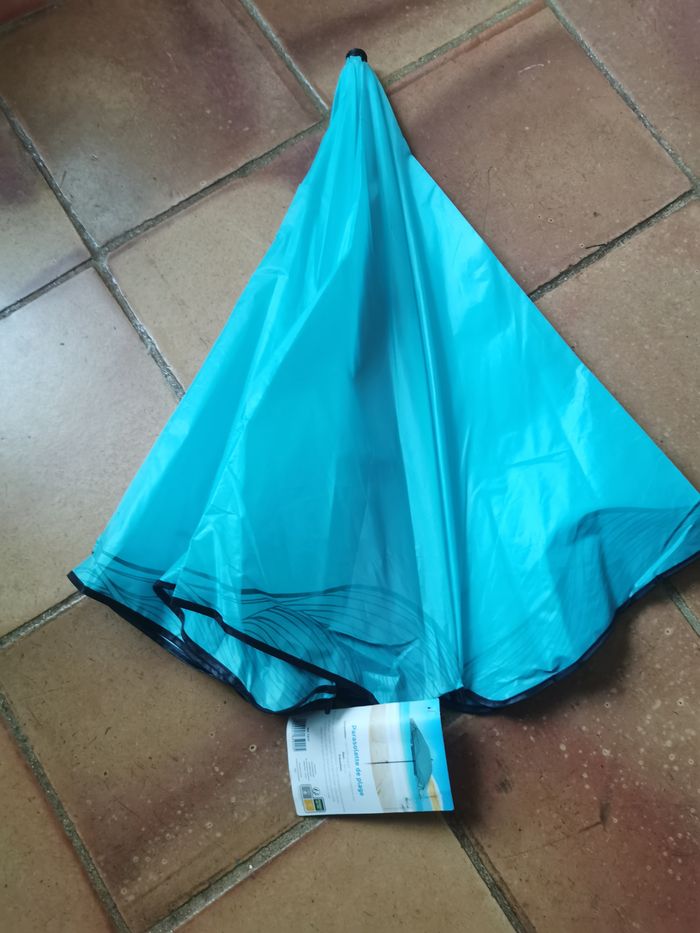 Parasol bleu neuf avec étiquette, composition : toile 100% polyester, mât et baleines en acier. Diamètre 130 cm au lieu de 140 cm (affichés sur l’étiquette), longueur 80 cm, il manque le piquet et l’embout au-dessus. Poids 450 g