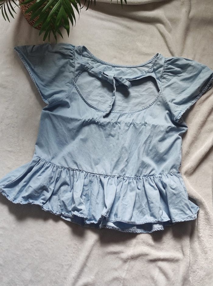 petit haut / tee shirt / blouse jean a manches courtes volant et taille large. Petite attache à l'arrière. Marque promod en taille unique.