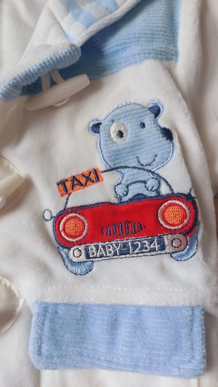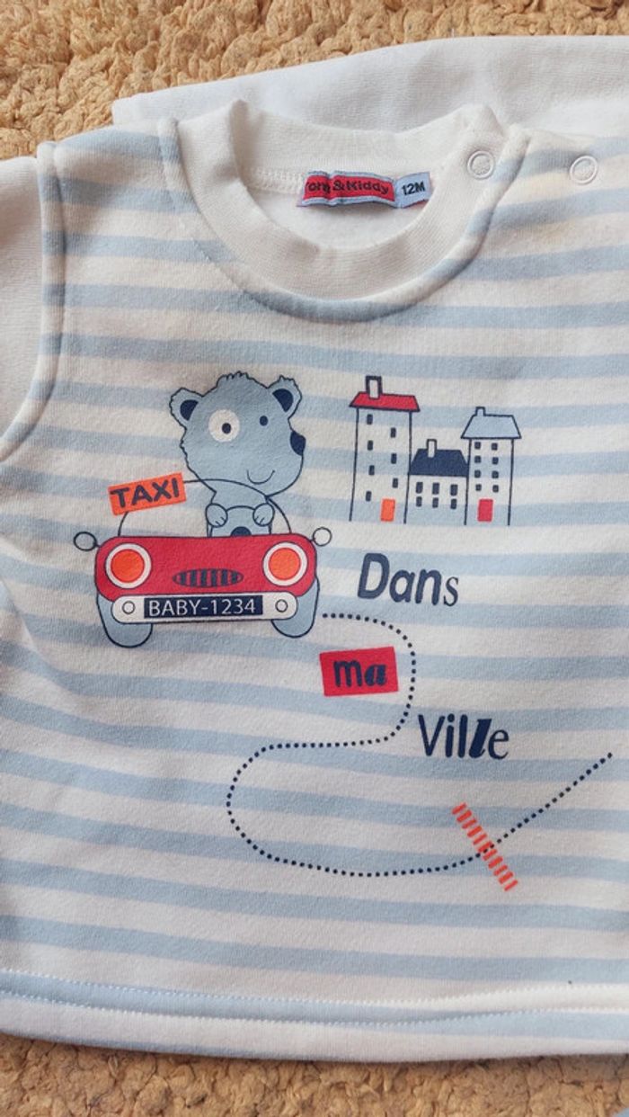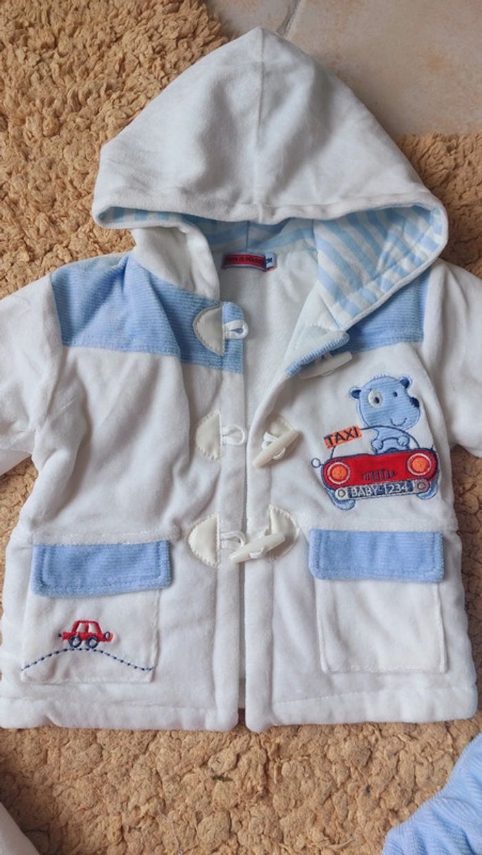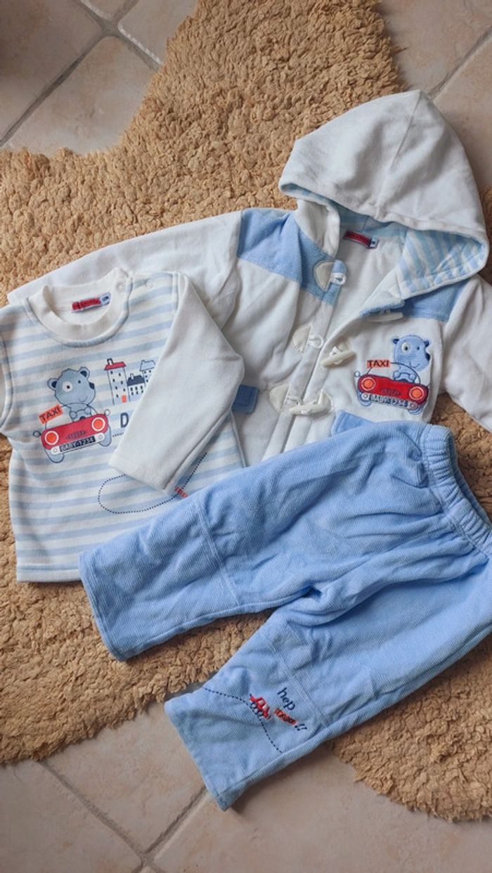 Comme neuf Porté 1 mois pour une occasion Sweat-shirt, pantalon et manteau Tout est assortis Ours et voiture , style marinière Très joli ensemble