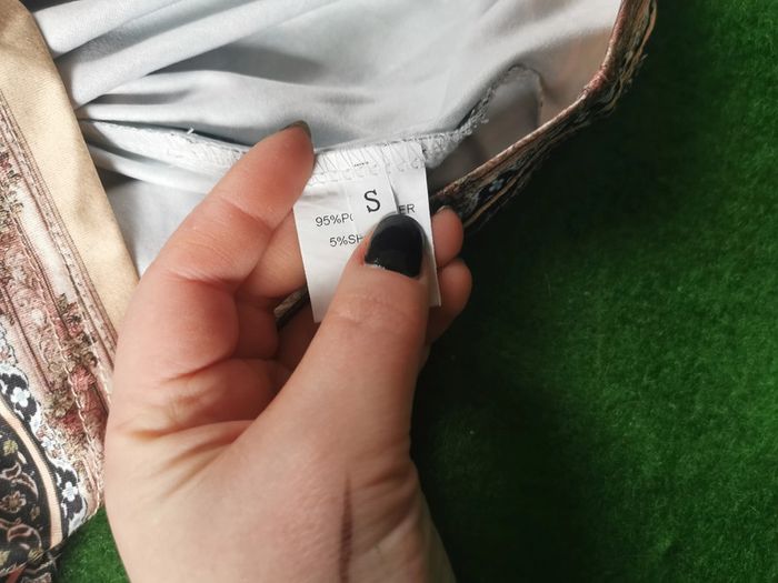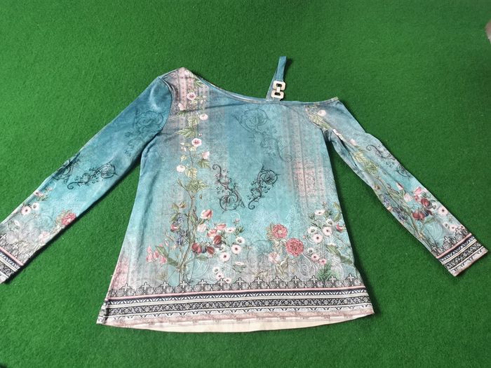 Haut vert à fleur épaule découverte bretelle chaîne dorée en plastique ou métal très fin. Joli haut à imprimé type foulard, composition : 95% polyester, 5% spandex, une épaule est découverte avec les manches longues. En très bon état, le mannequin fait la taille 36. Le haut n'a pas d'étiquette de taille, je pense que c'est du 38 (voir les mesures ci-dessous). Mesures : Largeur dos entre les aisselles : 47 cm Largeur dos entre les épaules : 41 cm Largeur taille : 51 cm Longueur : 62 cm Longueur manche depuis l'aisselle : 47 cm Longueur manche depuis l'épaule : 63 cm Largeur manche : 15,5 cm Poids : 158 g #hautfantaisie #hautmancheslongues #epauledecouverte #hautepauledecouverte #hautvert #hautfoulard