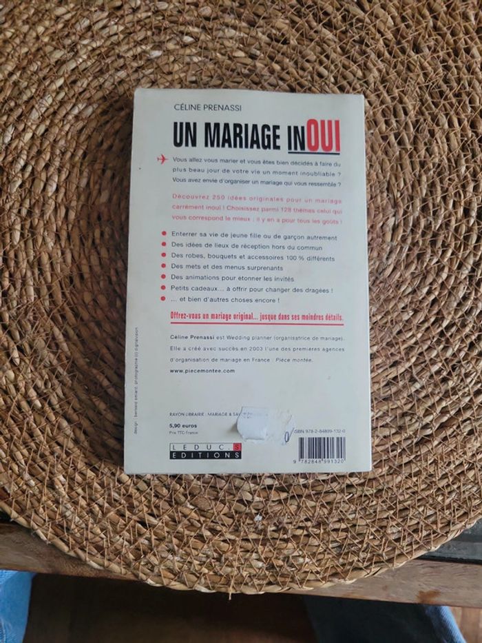 Un mariage inOui: 250 idées originales pour un mariage hors du commun Organisatrice de mariages, l'auteure propose des idées originales et des conseils pratiques pour faire de chaque étape du mariage un moment inoubliable : enterrement de la vie de célibataire, cérémonie, moyen de locomotion, animations... Très bon état. Lot possible sur demande avec divers articles de mon dressing. Envoi sous 24h_48h