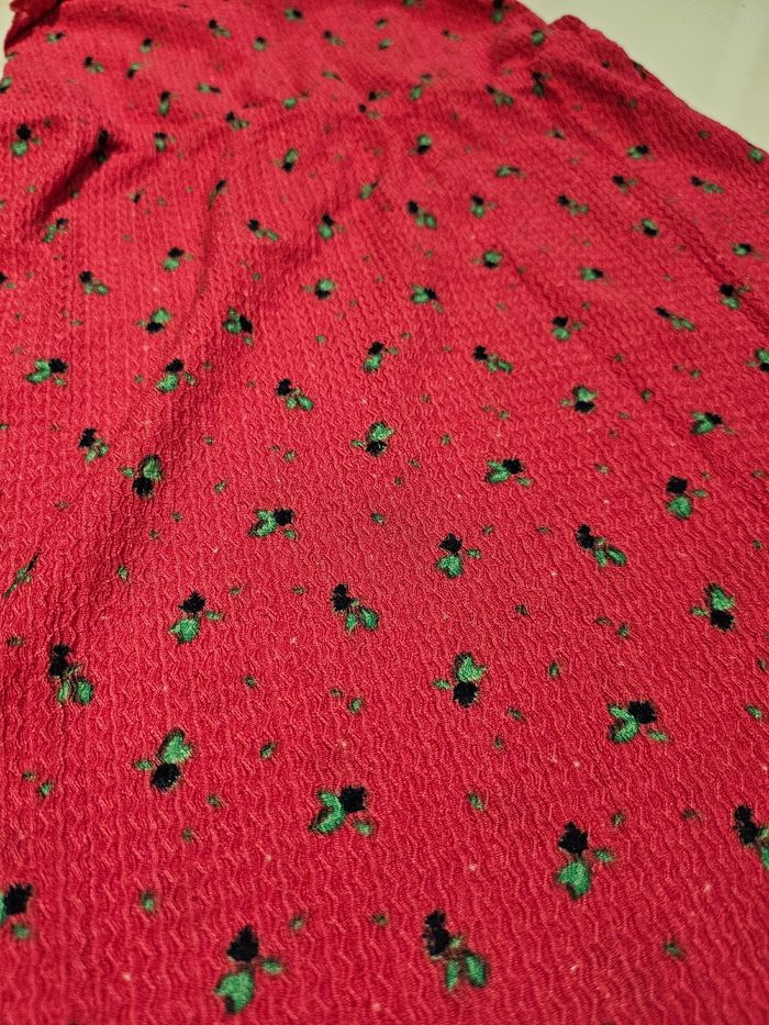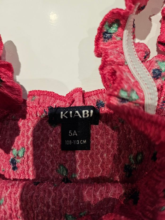 Robe courte à bretelles courtes. Élastique au niveau des bretelles et dans le haut. Matière légère. Fuchsia avec imprimés. Marque : Kiabi Taille : 5 ans