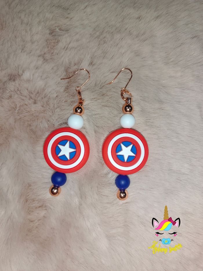 Ses boucles d'oreilles Marvel Captain America fantaisies pendantes sont parfaites pour vous embellir. Originales et uniques, à votre image, elles s'accorderont parfaitement à toutes vos tenues. Base en acier inoxydable, plusieurs coloris disponibles. Respect des normes CE, composée de perles silicone alimentaire et/ou bois naturel. 100% personnalisable, énormément de choix de clips, perles, etc… Envoyez-moi un message afin de créer main dans la main votre accessoire idéal. Une photo du prototype de celui-ci vous est envoyé pour validation avant envoi.