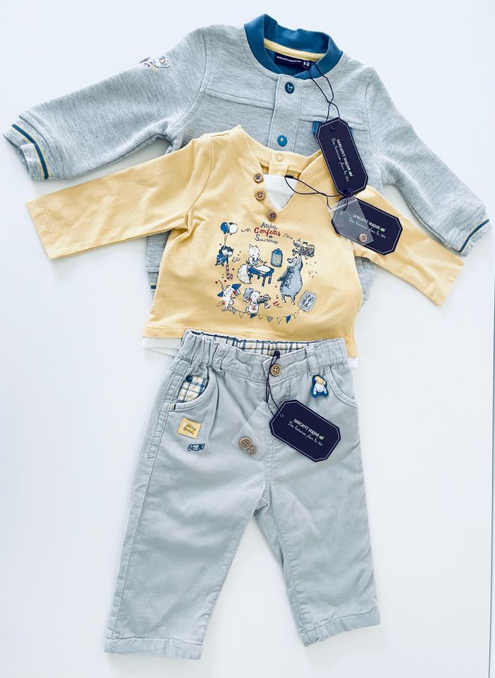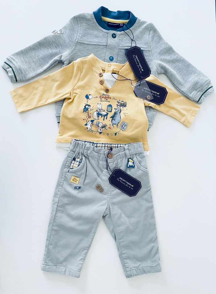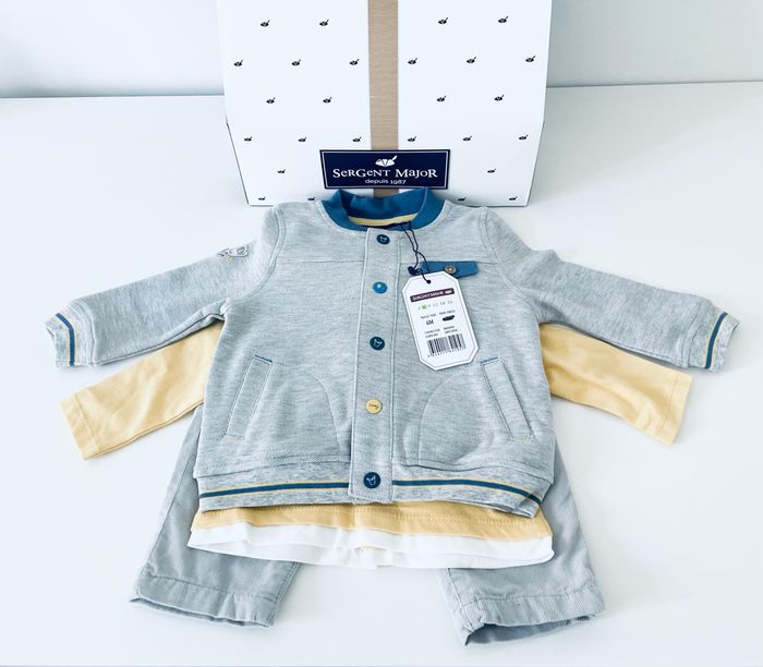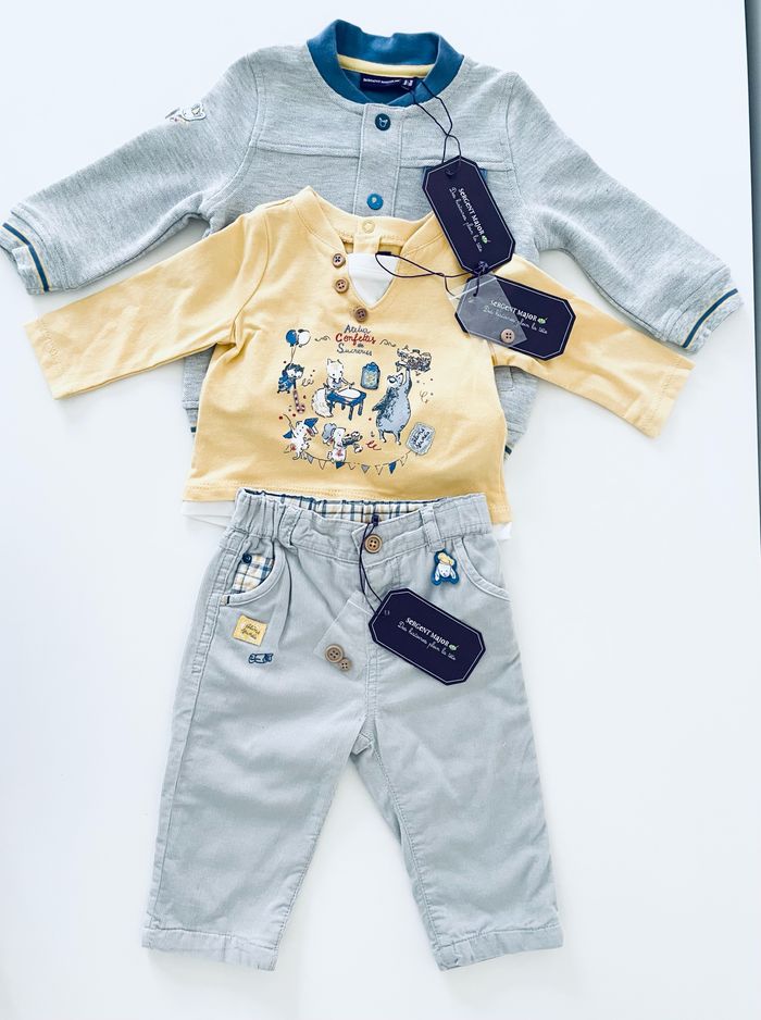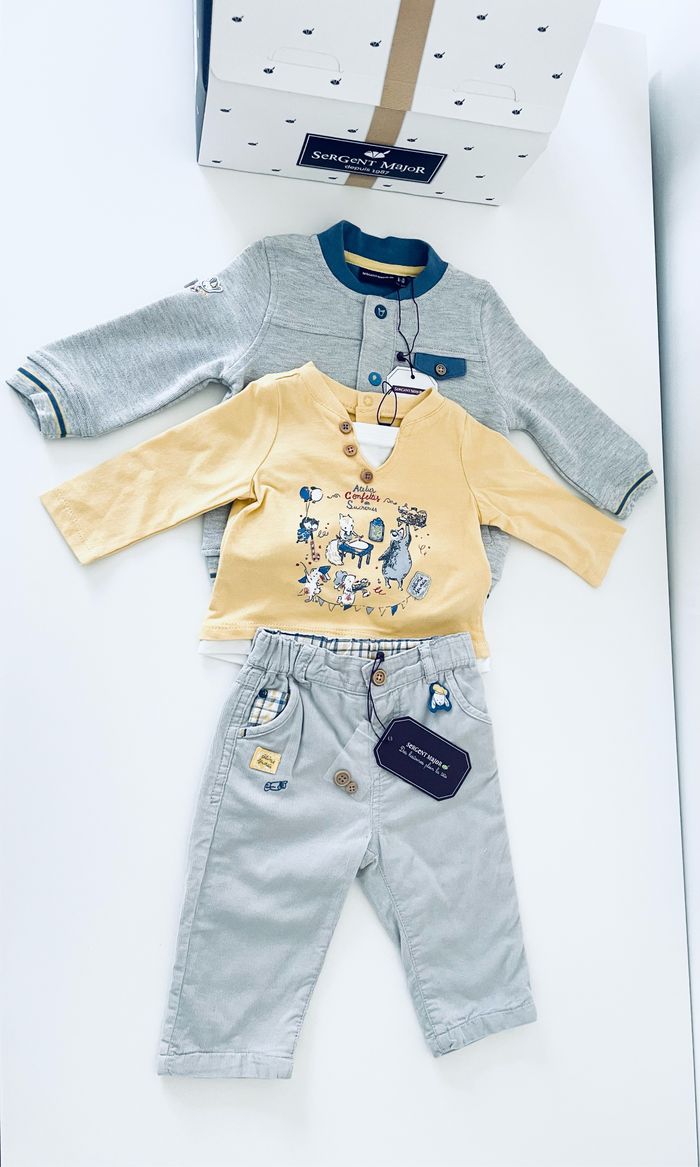Magnifique ensemble complet, Sergent Major comprenant : –un pantalon –un haut manches longues –une veste Taille 6 mois Article neuf avec étiquette Prix d’achat 95 €