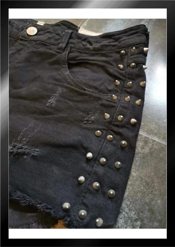 Short en jean noir destroy déchiré avec des clous sur les côtés, taille 38 M pull & bear