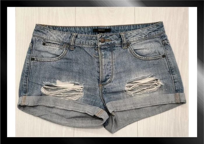 Short femme en jean bleu ciel et blanc style destroy déchiré taille M 38 forever 21