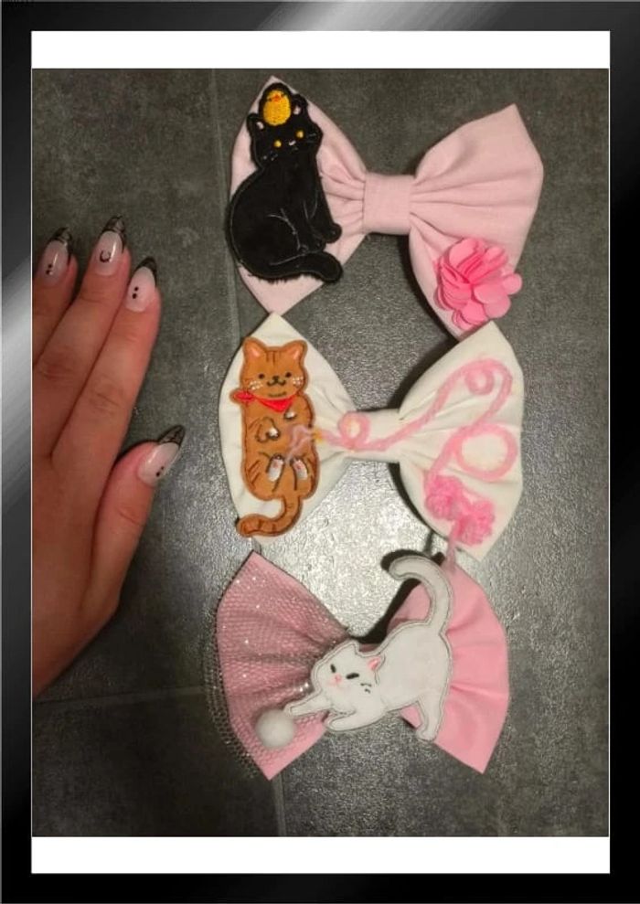 Très gros noeuds pour fille cheveux pince barrettes lot de 3 avec chats, rose blanc argenté noir... Neufs jamais portés faits par une créatrice
