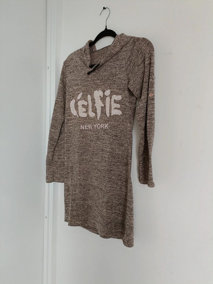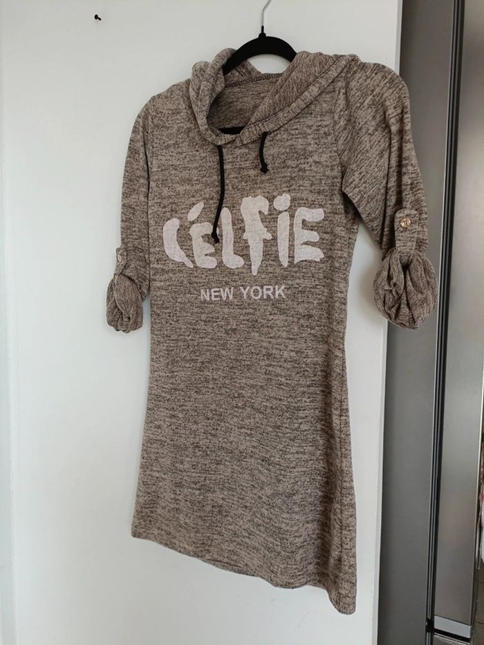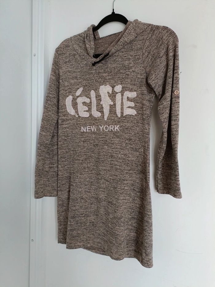 Mini robe à capuche moulante – Taille unique – Très bon état ✨ Craquez pour cette mini robe à capuche alliant confort et style ! ✔ Matière : Acrylique et élasthanne, tissu doux et extensible pour un ajustement parfait. ✔ Coupe : Moulante, épouse joliment la silhouette. ✔ Détails : Capuche avec cordon ajustable pour un look décontracté. Manches retroussables avec bouton ou à porter longues selon votre préférence. Inscription "Sélfie New York" sur le devant pour une touche tendance. ✔ Taille unique, s’adapte facilement à différentes morphologies. ✔ État : Très bon état. Idéale pour un style casual chic au quotidien ! 💕