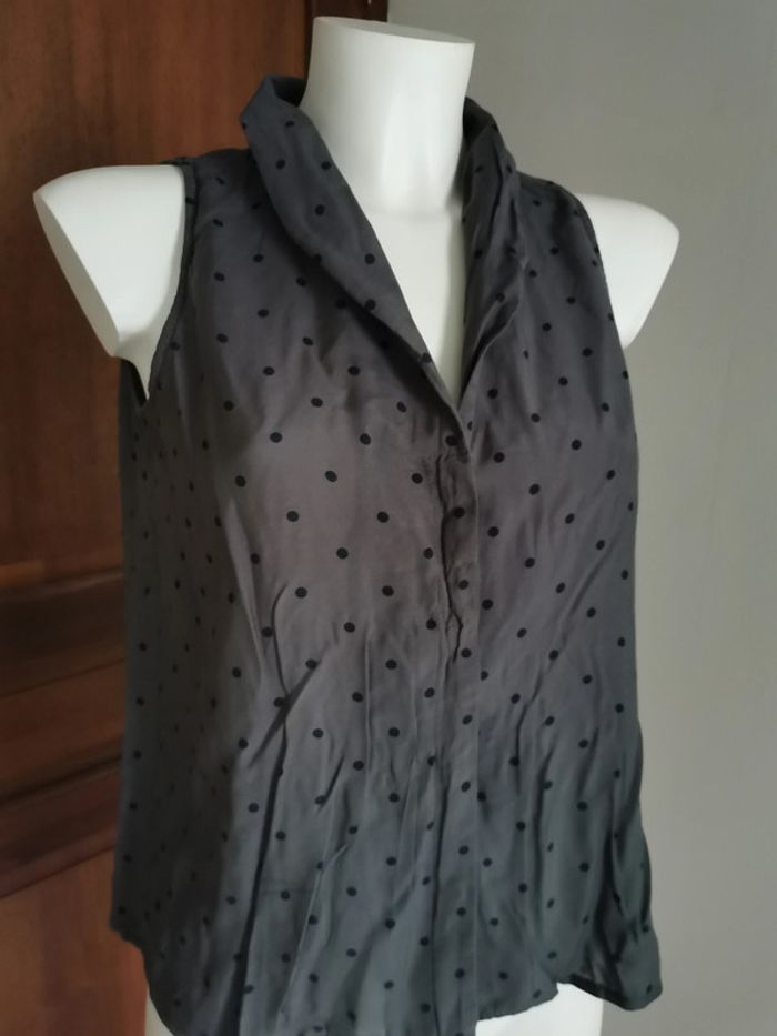 Blouse gris à pois noirs, marque Sud express, taille L, composition : 70% viscose, 30% soie. Attention taille petit, voir les mesures avant tout achat ! En très bon état, sans manches. Mannequin fait la taille 36. Mesures : Largeur dos entre les aisselles : 52 cm Largeur dos entre les épaules : 30 cm Tour de bras : 48 cm Largeur taille : 54 cm Longueur : 62 cm Poids : 67g #blouseapois #sudexpress #blousesansmanches #blousesoie #blousegris