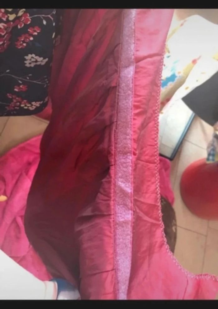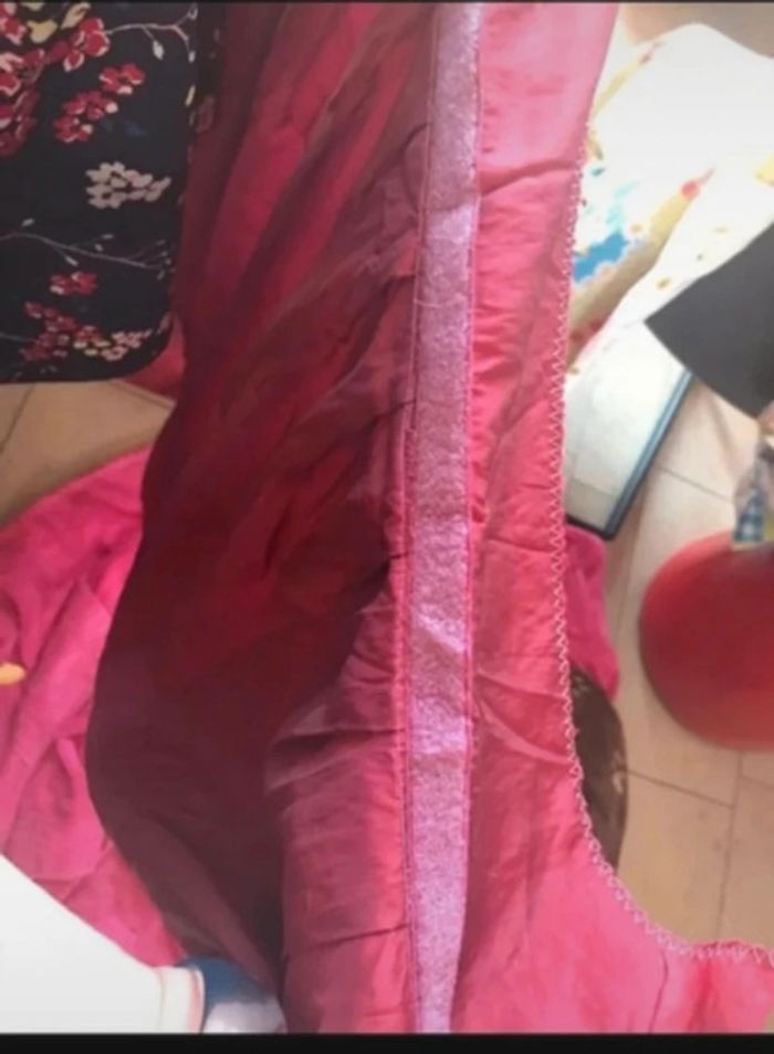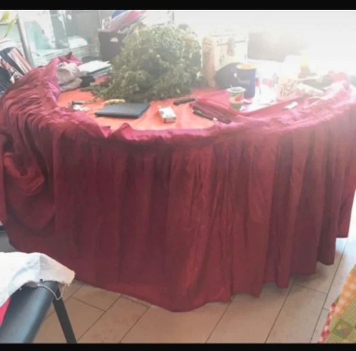 nappe de table ronde et ovale de couleur bordeaux nappe à strach 3m80de large pour 85 cm de long jolie retombée plisse effet satiné nappe entouré pour adhère à la table faut rajouter du strach autour de la table utilise pour un mariage légère tache dans le bas du satin