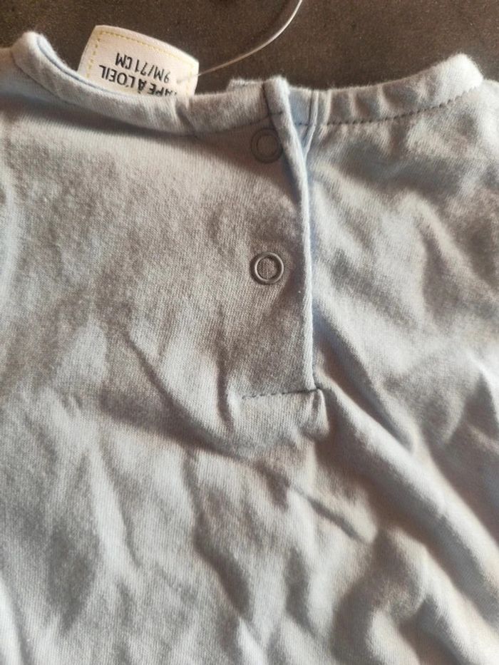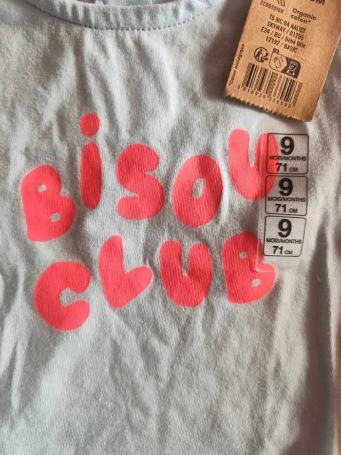 Tee shirt manche courte bleu ciel avec inscription "bisous club". Neuf avec étiquette