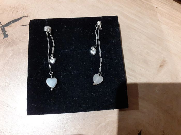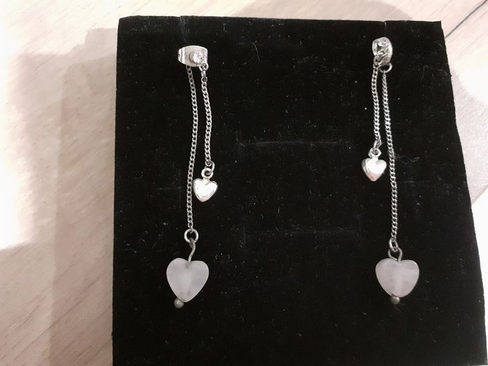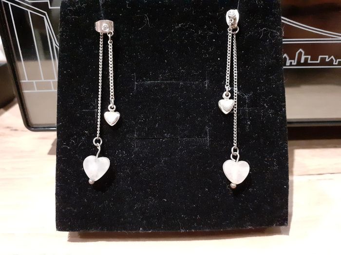 Boucle d'oreille argenté avec 2 pendentifs cœurs, un argenté et un rose clair en pierre. Mesure environ 6cm. En très bon état Envoi rapide, soigné et sécurisé.