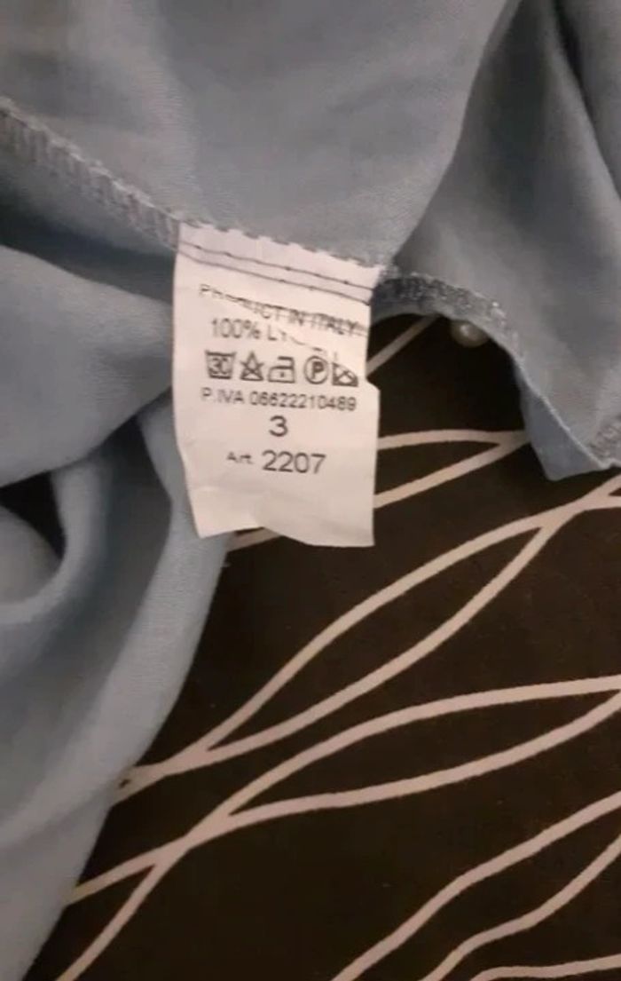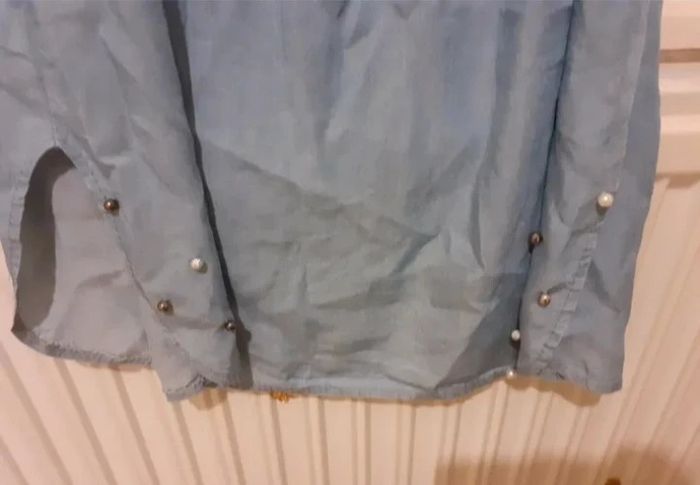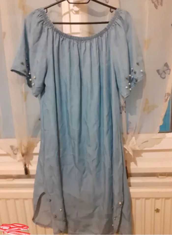 Robe bleue jeans, avec perles en bas de la robe de chaque côté et au manches. Manche courte. Col rond. Longueur 85cm environ. Largeur d'aisselle à aisselle : 55cm environ Taille L. En très bon état Envoi rapide, soigné et sécurisé.