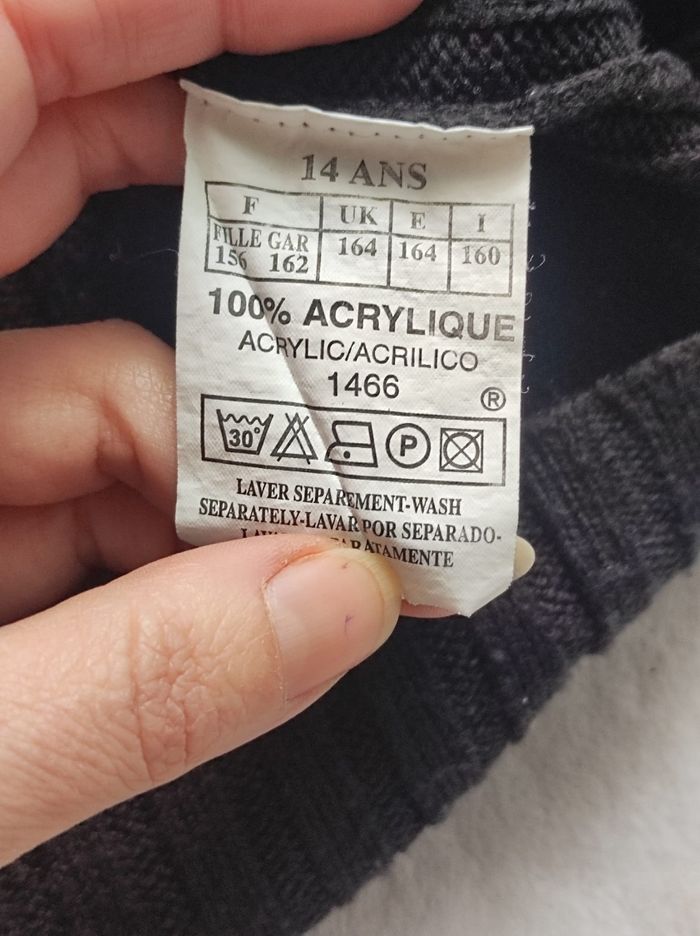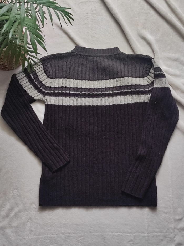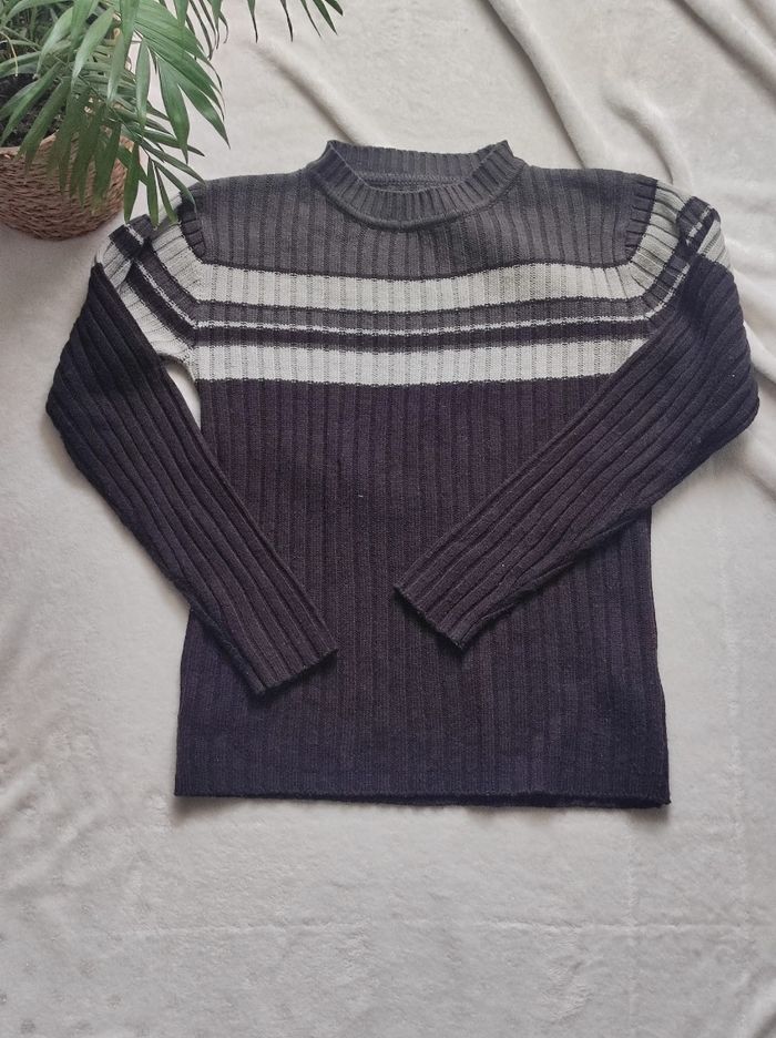 petit pull côtelé avec petit col montant et manches longues ( mixte ). Couleur tricolore ( gris clair / foncé et noir ). 100% acrylique en taille 14ans. Ni trou tâches ou déchirures.