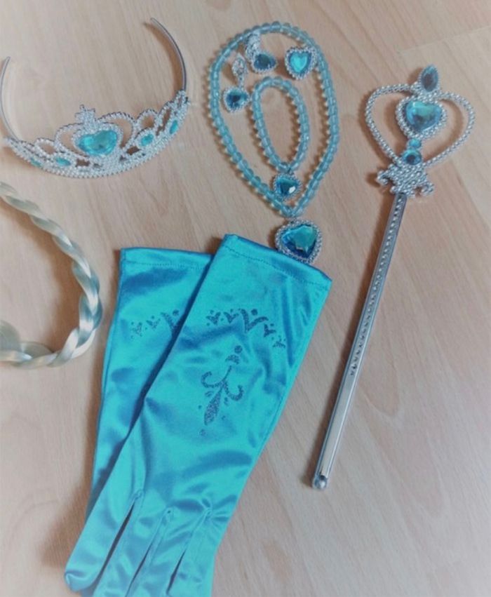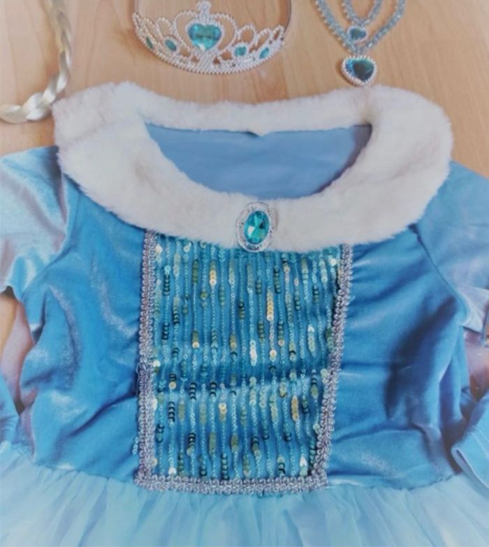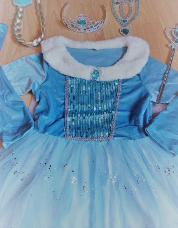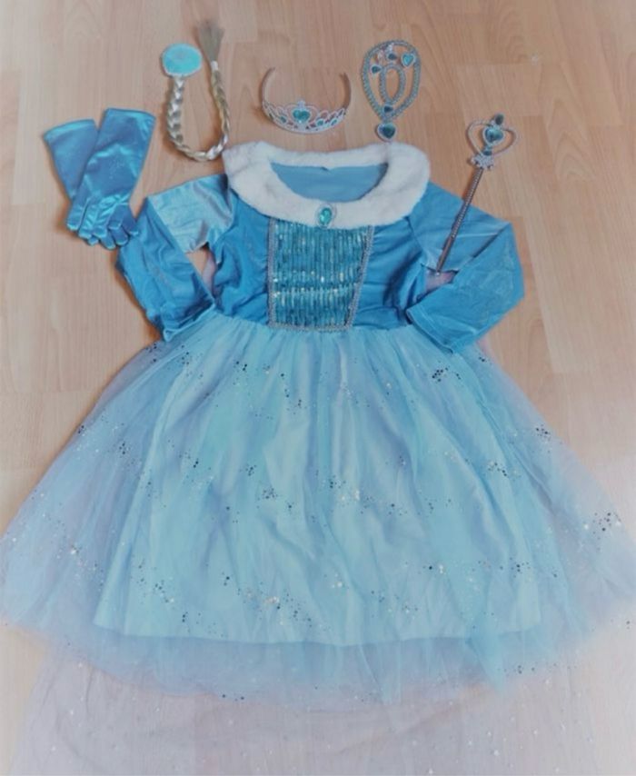 Déguisement robe princesse bleu manche longue et ces accessoires (couronne, baguette, gants, tresse, bijoux). La robe mesure 80cm de longueur et 95cm de longueur avec la traîne. La taille convient aux petites filles de 5-6ans. Totalement neuve, vendue dans son emballage d’origine. Expédition rapide après votre commande