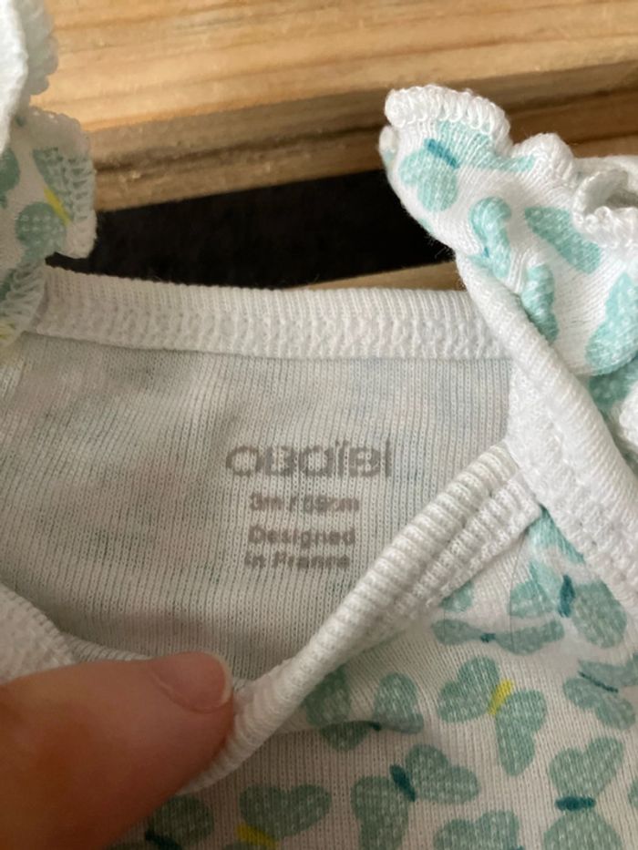 Lot deux bodies débardeurs obaibi 3 mois Un blanc à pois turquoise Un blanc motif papillons bleu/vert
