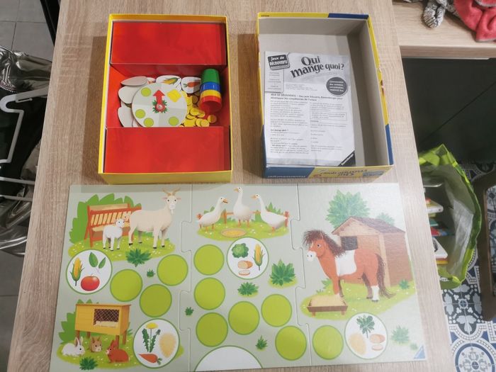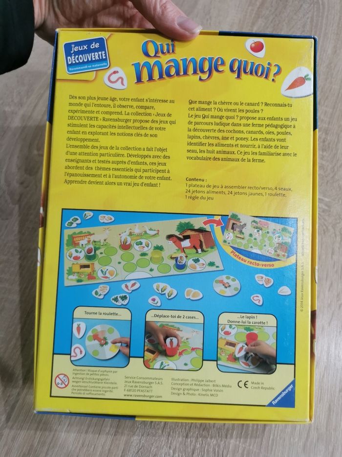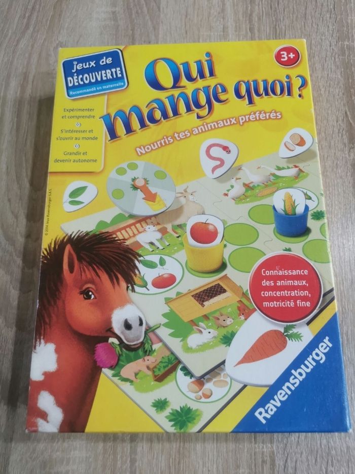 Jeu de société de la marque Ravensburger "qui mange quoi?". Il est complet et en très bon état. Ce jeu propose de découvrir les animaux de la ferme et leur mode d'alimentation. A travers un parcours ludique dans une ferme pédagogique, les enfants partent à la rencontre des cochons, canards, oies, poules, lapins, chèvres, âne et poney.