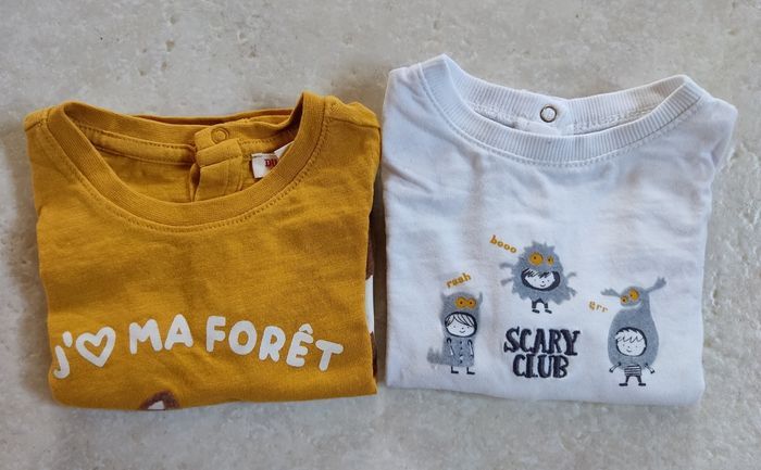 Lot de deux tee-shirts manches longues en très bon état, voir neufs. Marque : Du Pareil Au Même et Kiabi. Taille 6 mois.