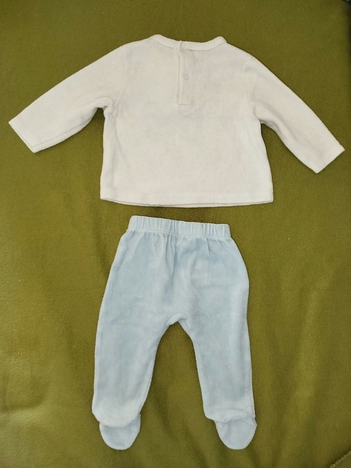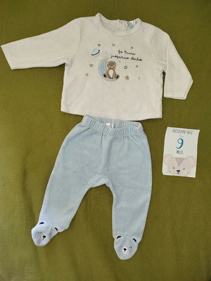 Pyjama 2 pièces motif ours dans l'espace. Bas bleu ciel, haut blanc. Marque Manon & Valentin, taille 9 mois. G122