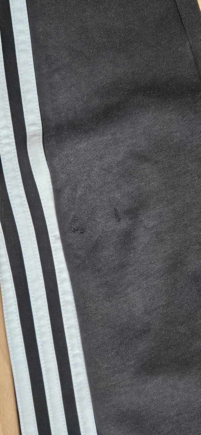 Jogging Adidas noir Taille 8 ans. Pas de trous mais deux petits accrocs au niveau du genou gauche (voir photo). A part cela, le jogging est encore en bon état.