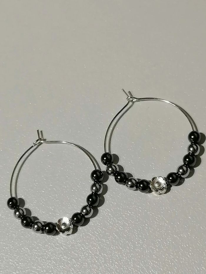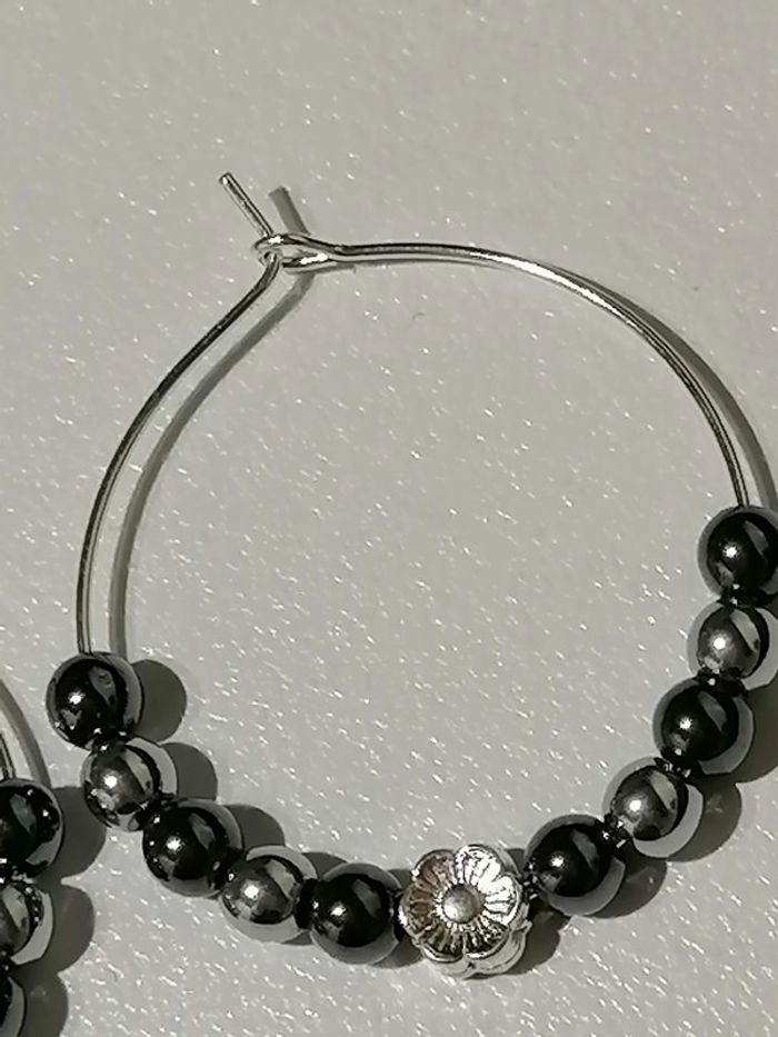 Jolie boucles d'oreilles créoles avec ses petites perles noires en hématite et ses petites fleurs argenté.