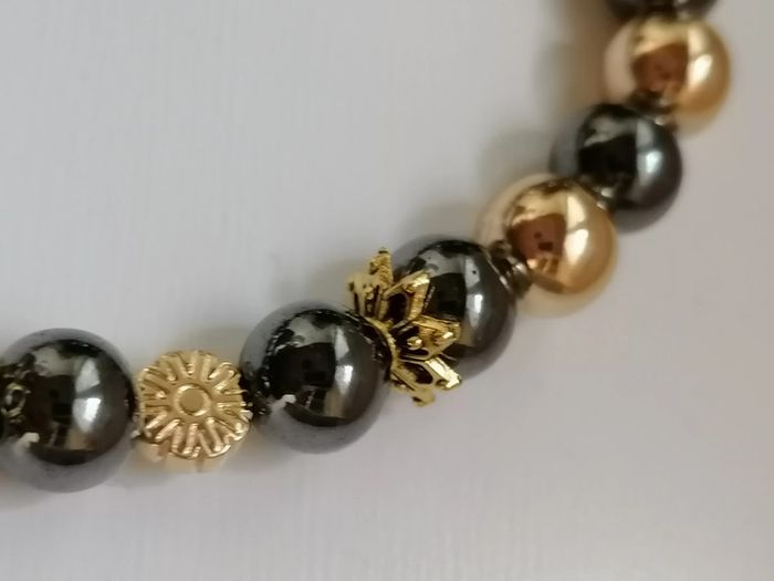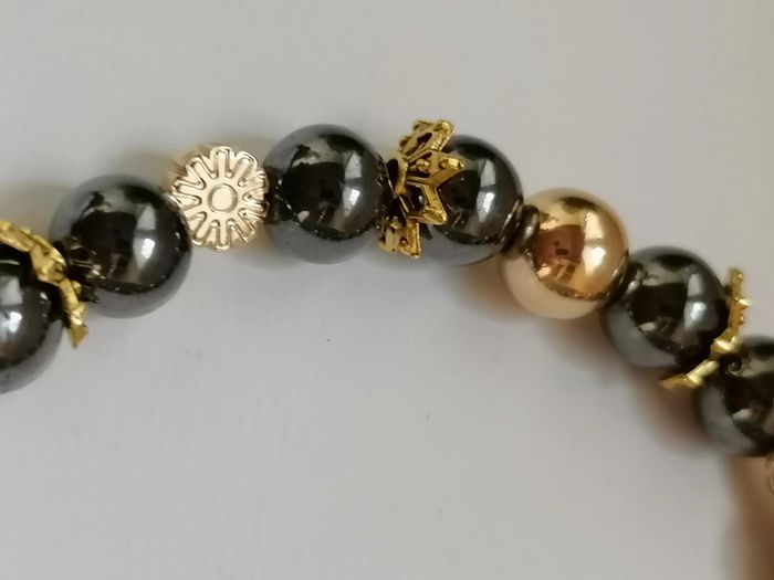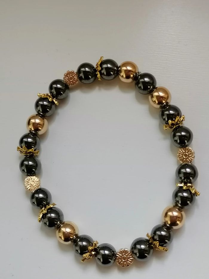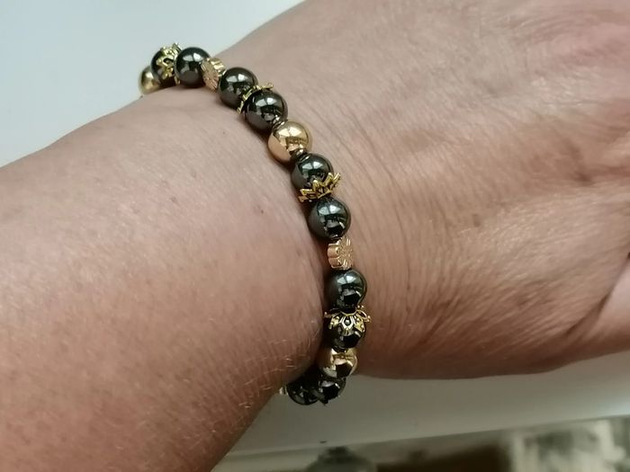 Jolie bracelet élastique avec ses jolies petites perles en hématite noires et dorées. Avec ses petites perles d'espacement en fleurs dorées.