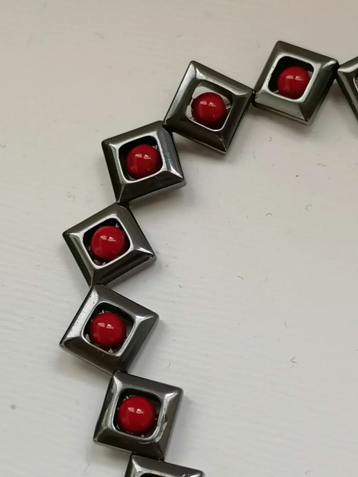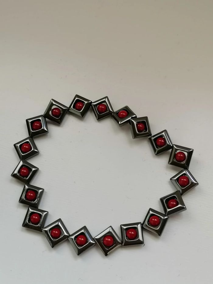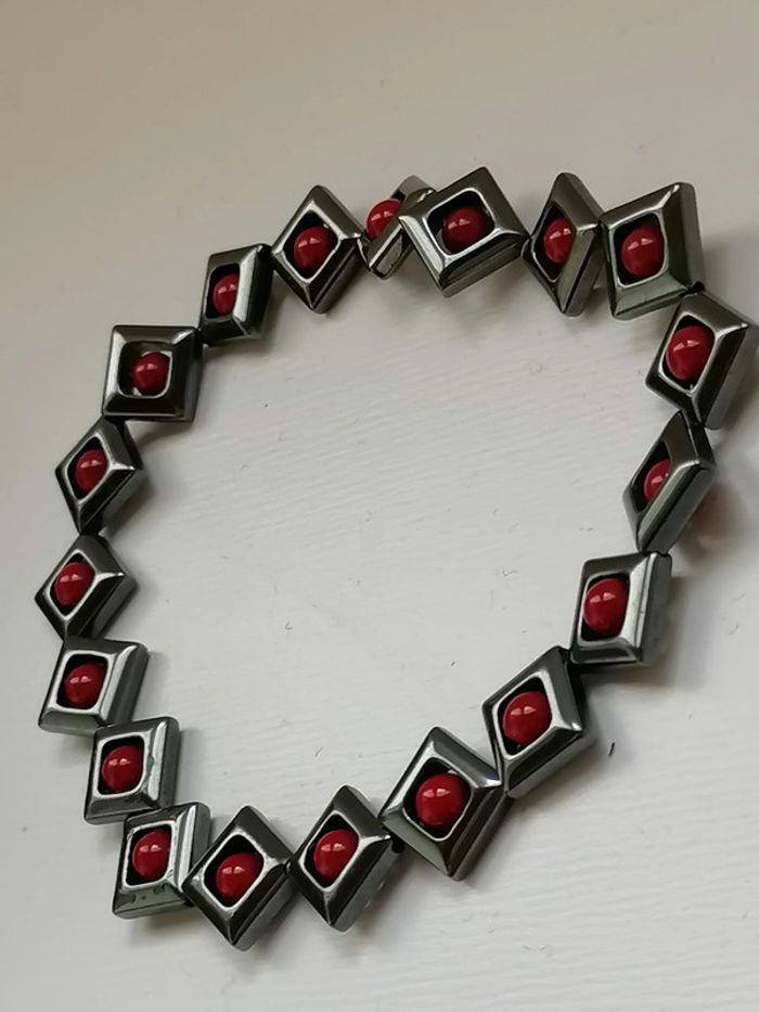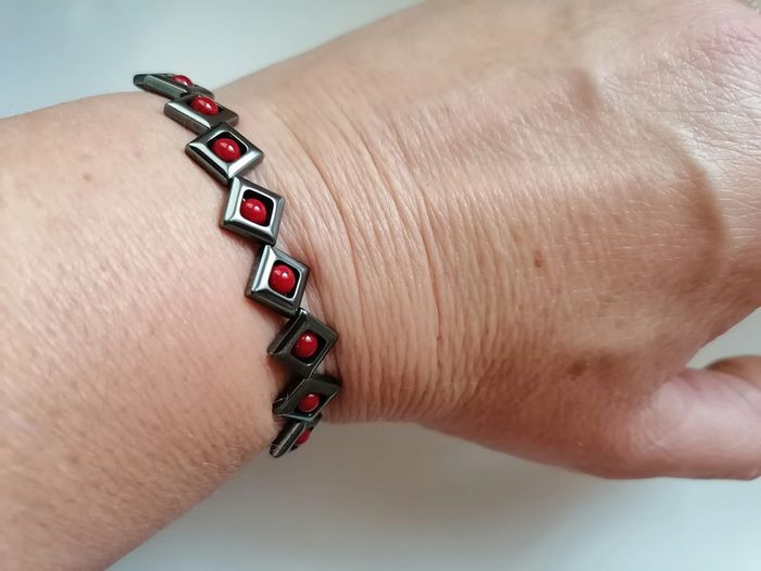 Jolie bracelet élastique avec ses véritables perles en hématite noires et ses petites perles rouge au centre.