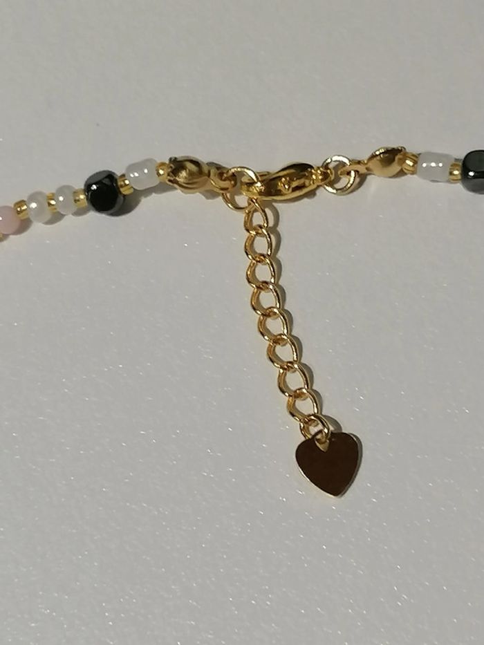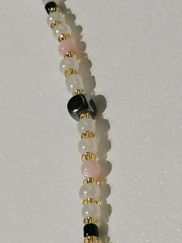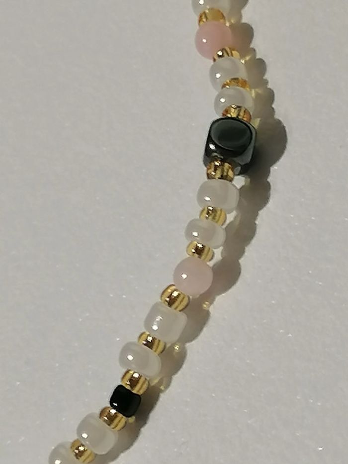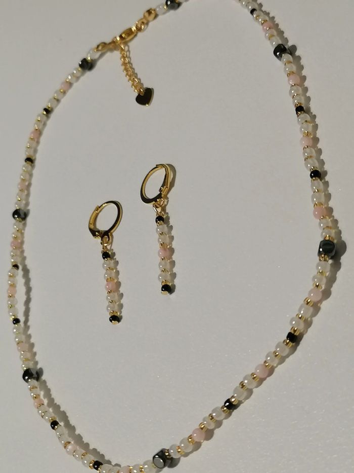 Jolie ensemble collier 43cm et ses boucles d'oreilles pendentif. Petites perles en hématite noires, perles d'espacement en verre dorée, perle en verre nacrés et petite perles rose.