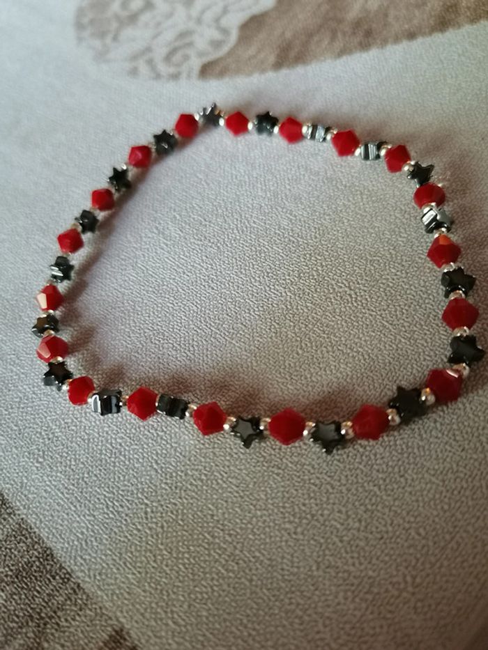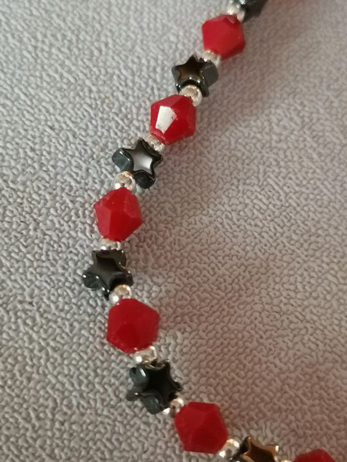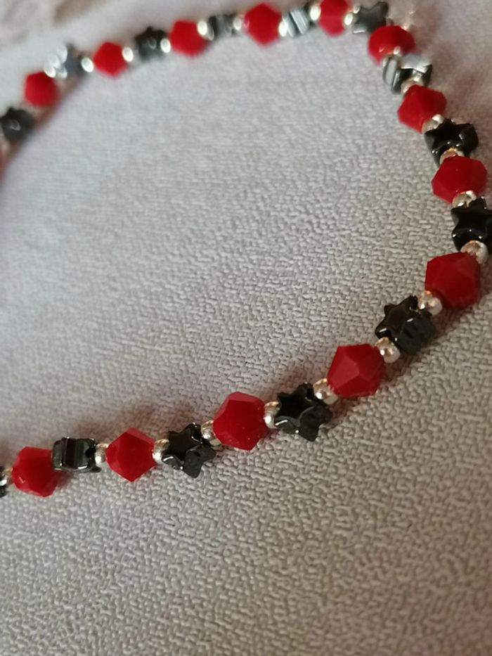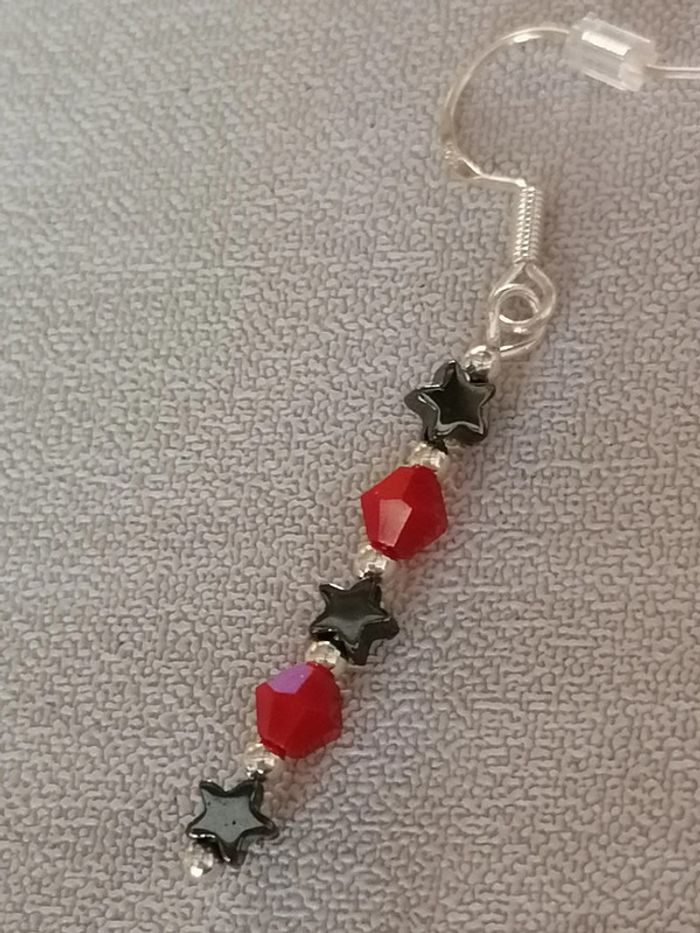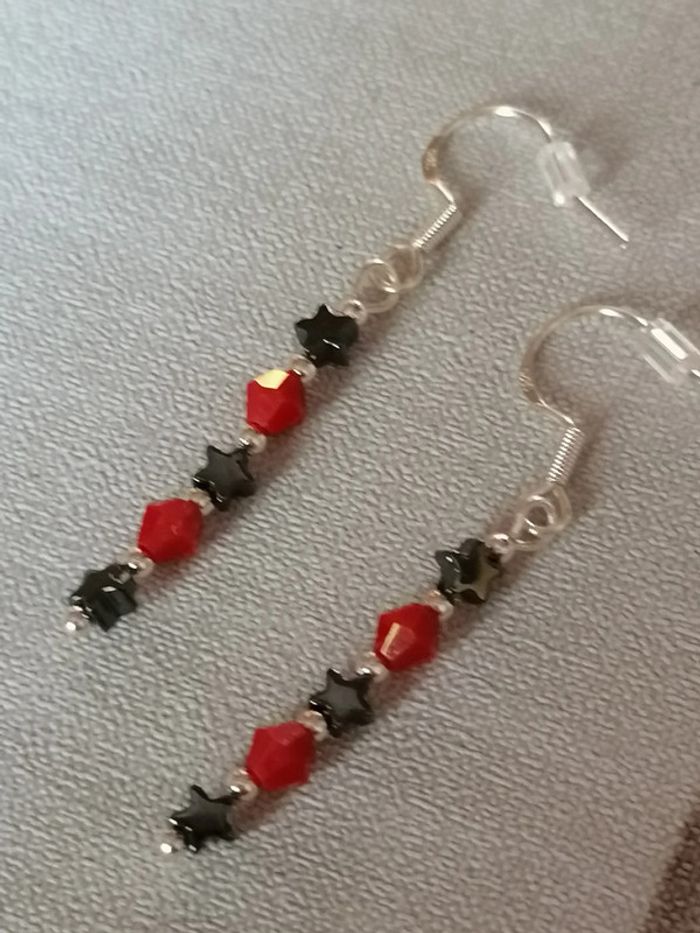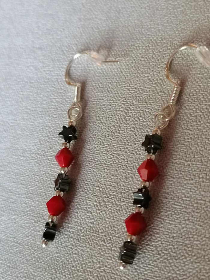 Jolie ensemble bracelet et ses boucles d'oreilles pendentif avec ses petites perles rouge et ses petites étoiles hématite noires ainsi que ses petites perles d'espacement argenté. Crochet en argent 925