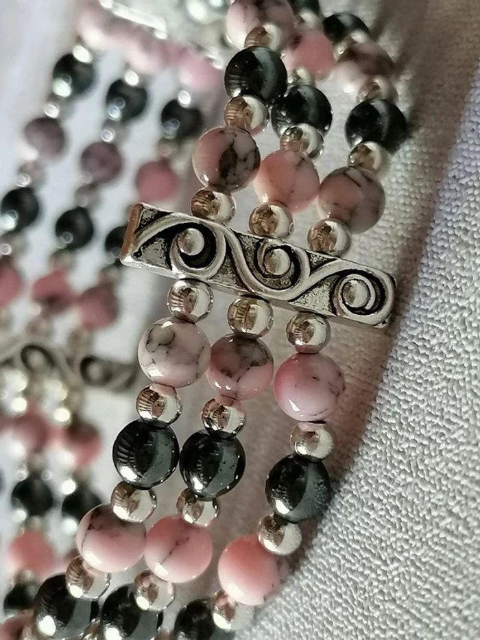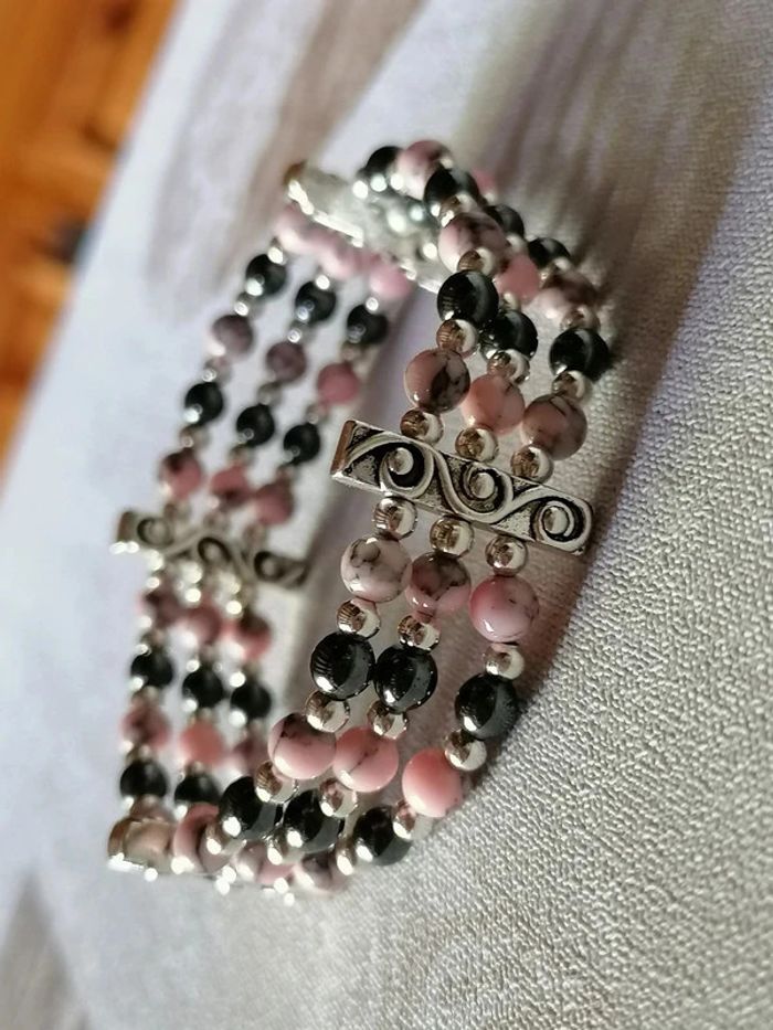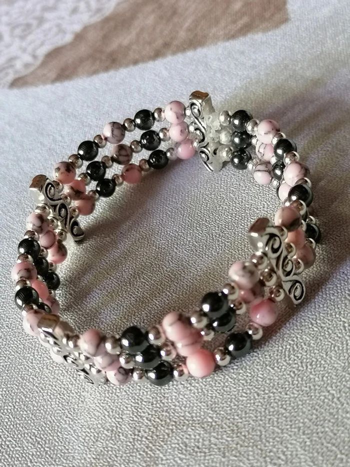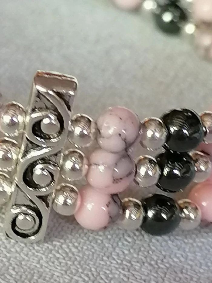 Jolie bracelet élastique triple avec ses jolies petites perles blanches et roses striée de noir et ses petites perles d'espacement argenté.