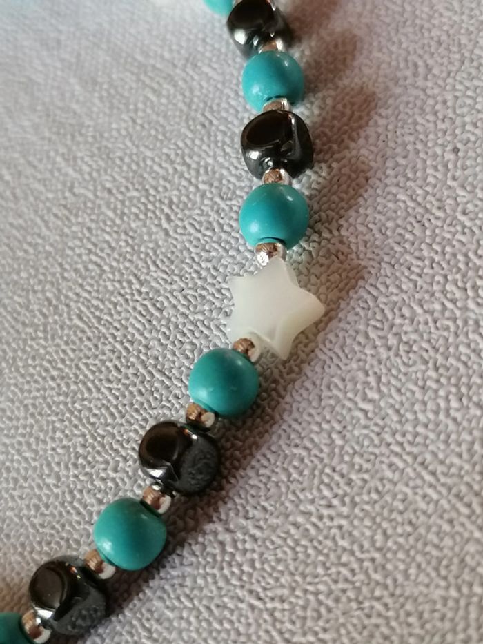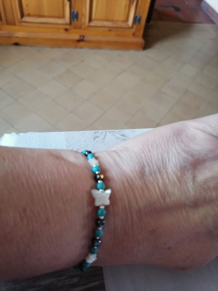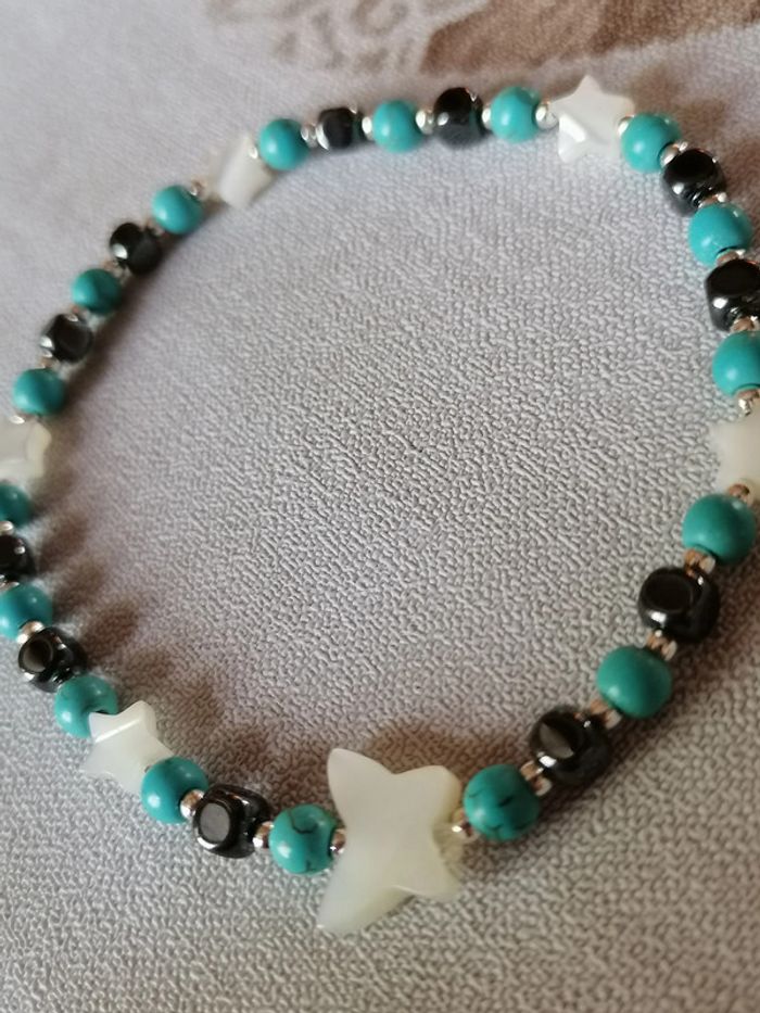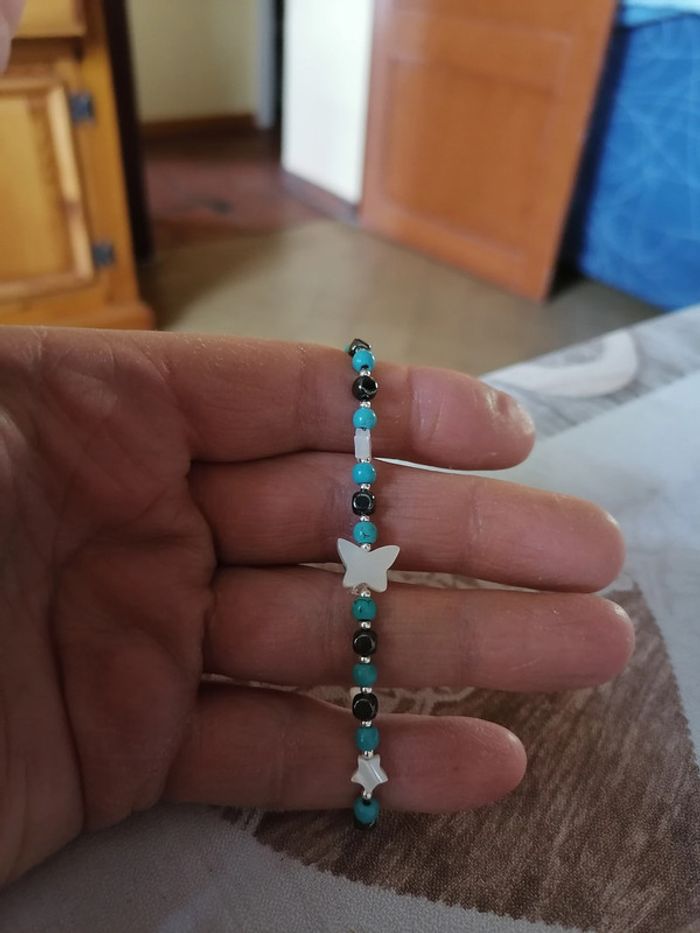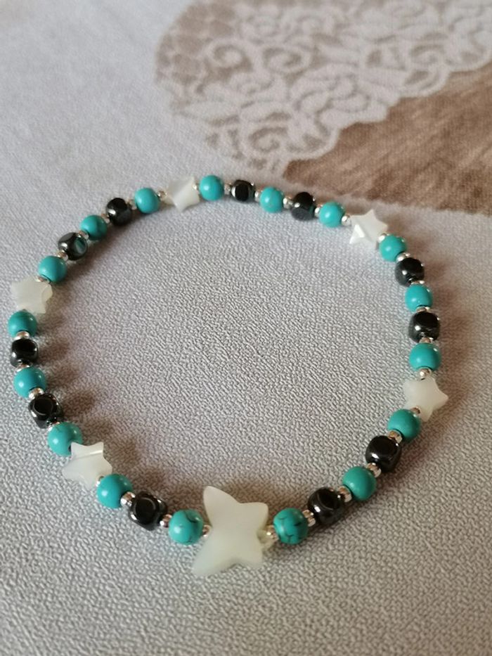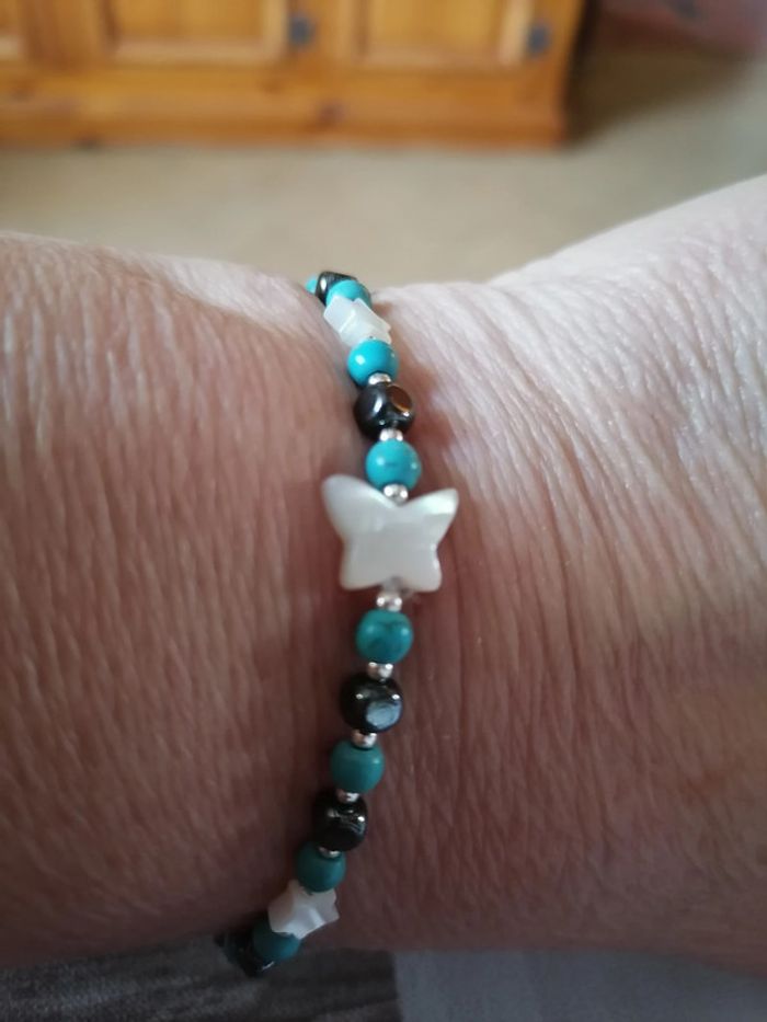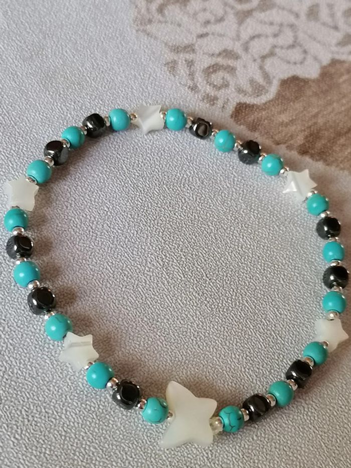 Jolie bracelet élastique avec ses jolies petites perles turquoise bleu, ses hématites, ses étoiles et son petit papillon 🦋 en nacrée blanc.