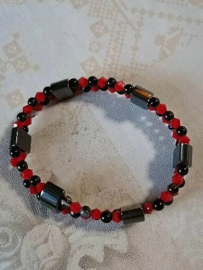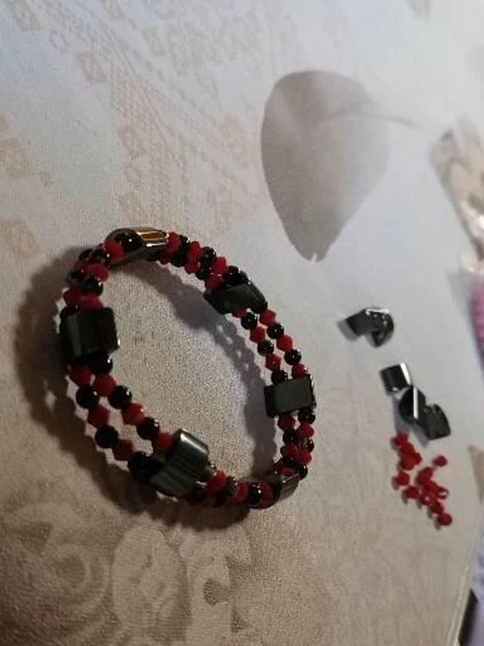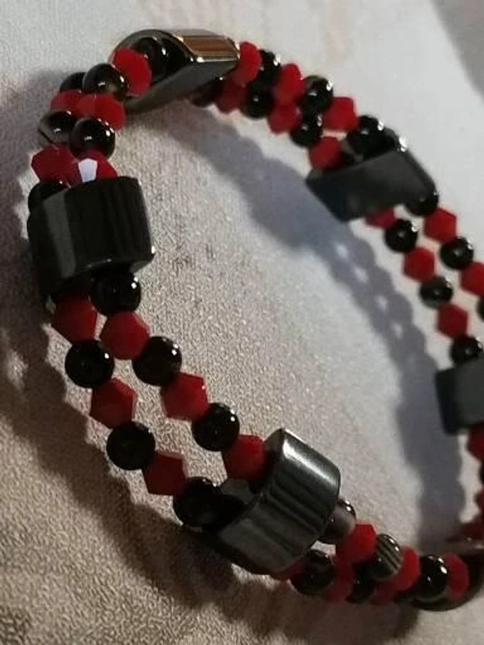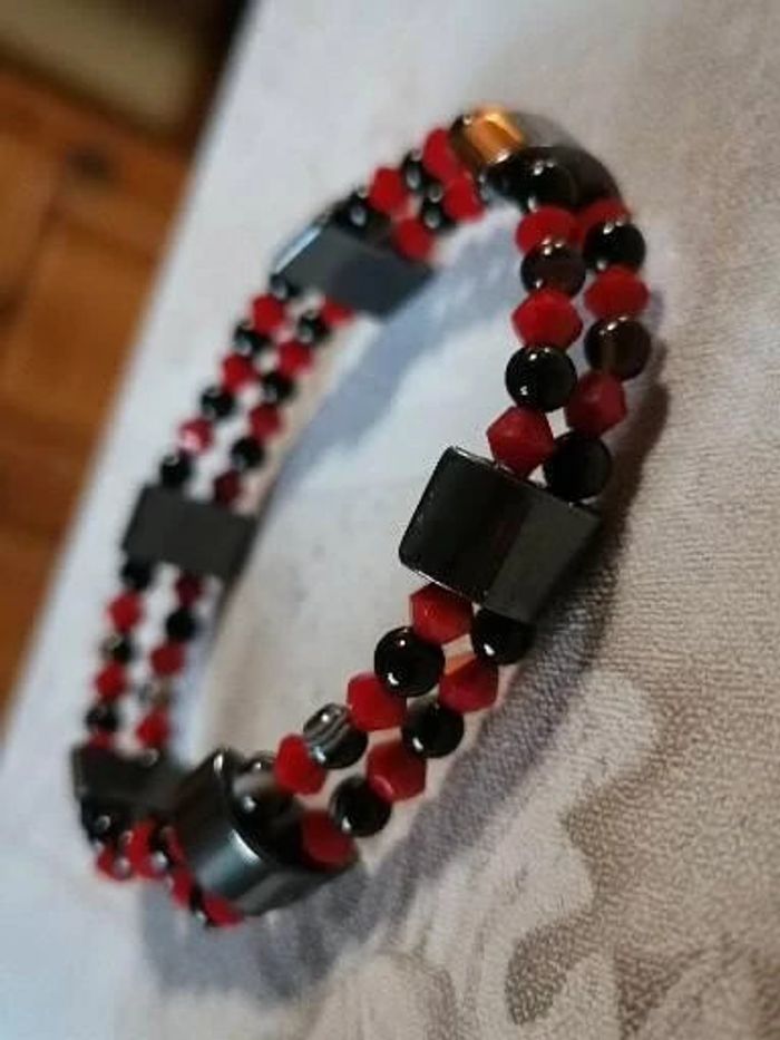 Jolie bracelet double avec ses véritables perles doubles en hématite noires. Ses petites perles rouge et noires.