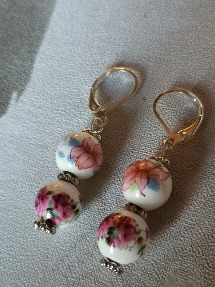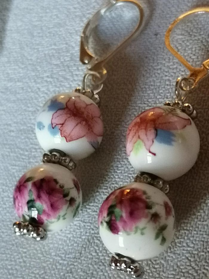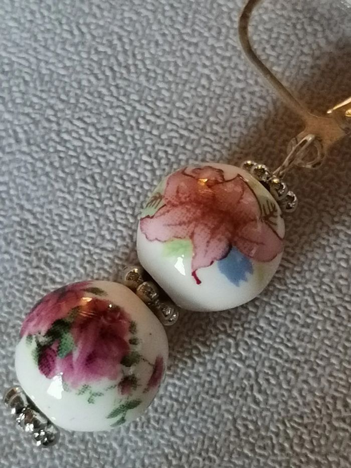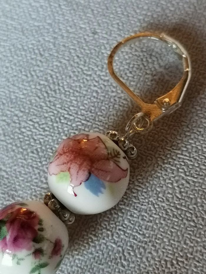 Joli boucles d'oreilles pendentif avec ses véritables perles en céramique fleuries.