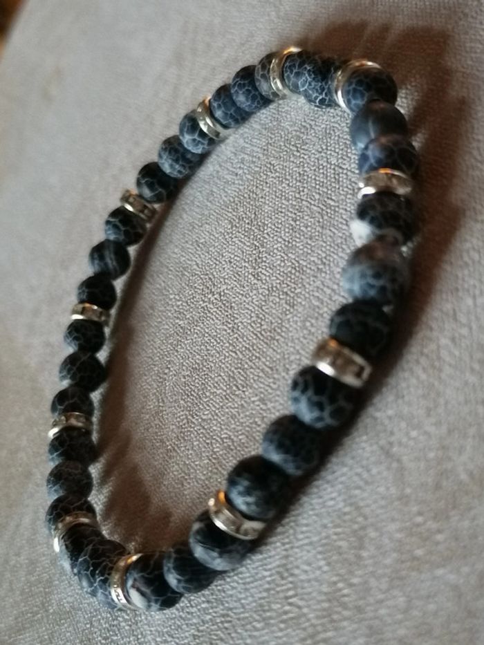 Bracelet élastique avec ses jolies petites perles grises givrées et ses petits strass.