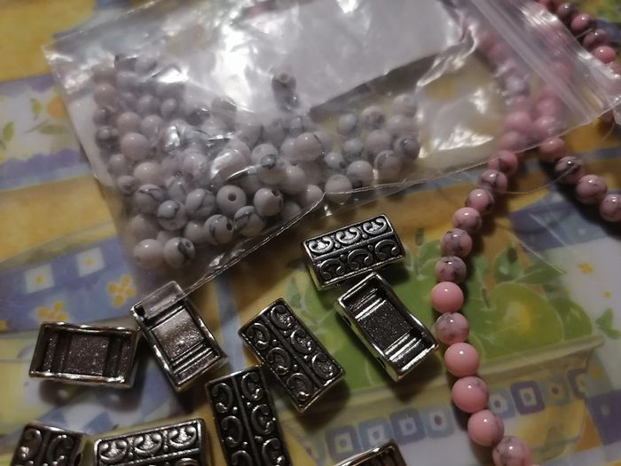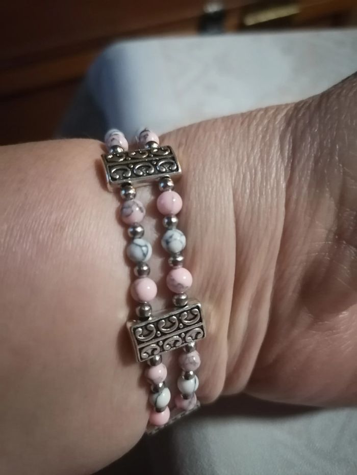 Jolie bracelet élastique double avec ses véritables perles en howlite rose et ses petites perles turquoise blanches naturelle. Porté juste pour la photo.