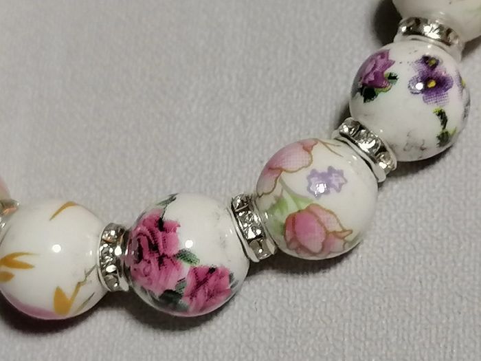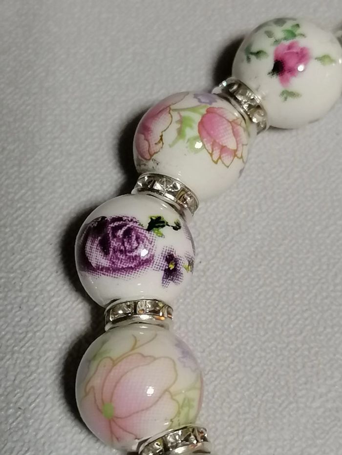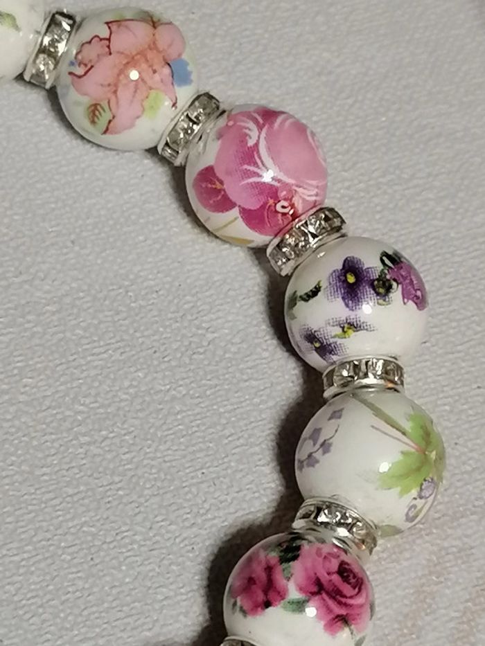 bracelet élastique avec ses jolies petites perles en céramique fleuries et ses petits strass